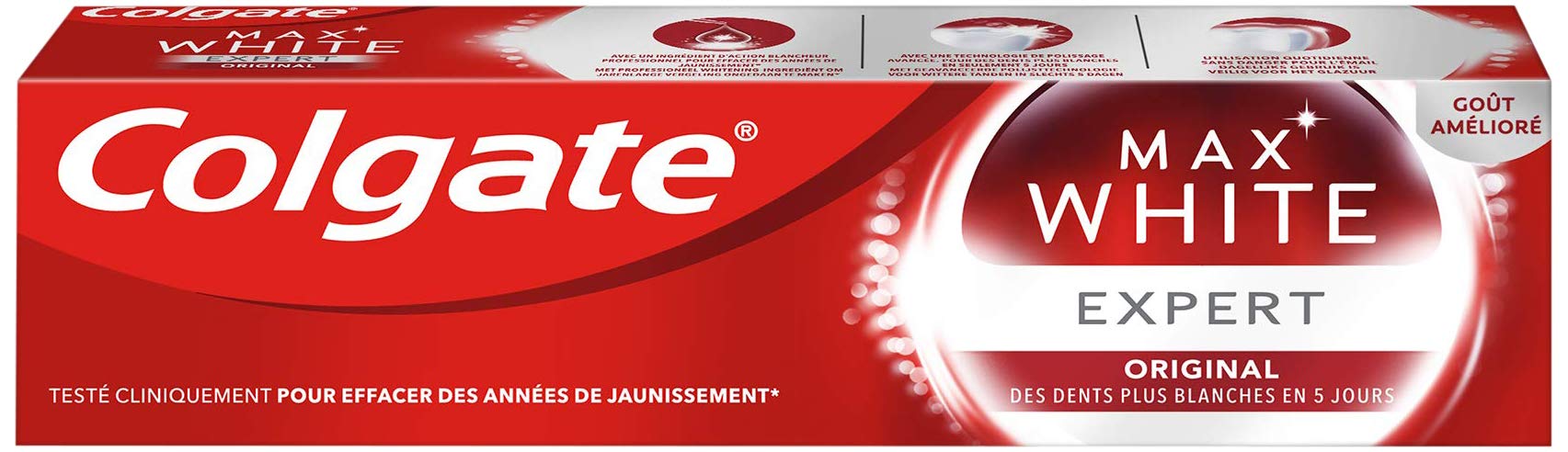 : Colgate Original White toothpaste with advanced polishing technology. For whiter teeth in 5 days. Contains a professional whitening ingredient, just like dentists use. Regular use of whitening toothpaste helps remove surface and new stains. Colgate MAX ORIGINAL WHITE is designed to go deeper. The unique hydrogen peroxide formula works on stains below the enamel surface and helps remove yellowing that has been there for years . Whiter teeth in 5 days. - Contains a whitening agent used by dentists. - Safe for enamel. For daily use. Visibly reduces stains caused by certain foods or drinks with daily use. Ingredients: Glycerin, calcium pyrophosphate, propylene glycol, PEG PPG 116-66 copolymer, PEG-12, PVP, tetrasodium pyrophosphate, sodium sulfate, lauryl sulfate, silica, aroma, sodium monofluorophosphate, sodium saccharin, phosphoric acid, hydrogen peroxide. P.when('A').execute(function(A) { A.on('a:expander:toggle_description:toggle:collapse', function(data) { window.scroll(0, data.expander. expander[0].offsetTop-100) }) }) Directions: Clean twice daily for 2 minutes. Close the tube after use. Safety Warning: Note: Toothpaste is not suitable for children under 6 years of age, except under adult supervision. In case of contact with eyes, rinse. Do not swallow. See moreFor whiter teeth after 5 days. The first toothpaste with 0.1 hydrogen peroxide.Description du produit Dentifrice blanc original Colgate avec une technologie de polissage avancée. Pour des dents plus blanches en 5 jours. Contient un ingrédient blanchissant professionnel, comme le dentiste l'utilise également. L'utilisation régulière de dentifrices blanchissants aide à éliminer les taches superficielles et nouvelles. Colgate MAX BLANC ORIGINAL est conçu pour aller plus profondément. La formule unique de peroxyde d'hydrogène agit sur les taches sous la surface de l'émail et aide à éliminer le jaunissement présent depuis des années . Dents plus blanches en 5 jours. - Contient un agent blanchissant utilisé par les dentistes. - Respecte le vernis. Pour un usage quotidien. Réduction visible des taches causées par certains aliments ou boissons lors d'une utilisation quotidienne. Ingrédients Glycérine, calcium pyrophosphate, propylène glycol, PEG PPG 116-66 copolymer, PEG-12, PVP, tétrasodium pyrophosphate, sulfate de sodium, lauryl sulfate, silice, arôme, monofluorophosphate de sodium, saccharine de sodium, acide phosphorique, peroxyde hydrogène P.when('A').execute(function(A) { A.on('a:expander:toggle_description:toggle:collapse', function(data) { window.scroll(0, data.expander. expander[0].offsetTop-100) }) }) Mode d'emploi Nettoyer deux fois par jour pendant 2 minutes. Fermez le tube après utilisation. Avertissement De Sûreté Remarque : le dentifrice ne convient pas aux enfants de moins de 6 ans, sauf sous la surveillance d'un adulte. En cas de contact avec les yeux, rincer. Ne pas avaler. Voir plusPour des dents plus blanches après 5 jours. Le premier dentifrice avec 0,1 de peroxyde d'hydrogène.Colgate Max White Original Dentifrice 75 ml 1