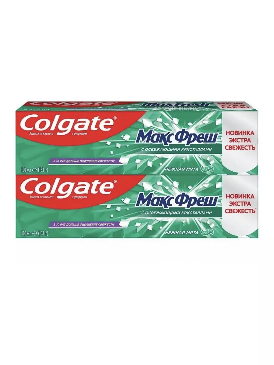 Освежающая зубная паста Colgate Макс Фреш Нежная мята подарит невероятное ощущение свежести для еще большей уверенности в себе! 1. Освежает дыхание — экстраосвежающая формула с передовой технологией интенсивно охлаждает, устраняет неприятный запах и дарит ощущение невероятной свежести. В 10 раз дольше ощущение свежести по сравнению с другими зубными пастами Colgate с фторидом. 2. Помогает бороться с кариесом 3. Приятный вкус мяты Рекомендовано: - для всей семьи - для ежедневного ухода - для профилактики кариеса - для борьбы с неприятным запахом изо рта Текстура: зеленый гель с белыми пластинками. Пластинки растворяются во время чистки зубов. Объем: 100 мл комплект из 2-х штук!