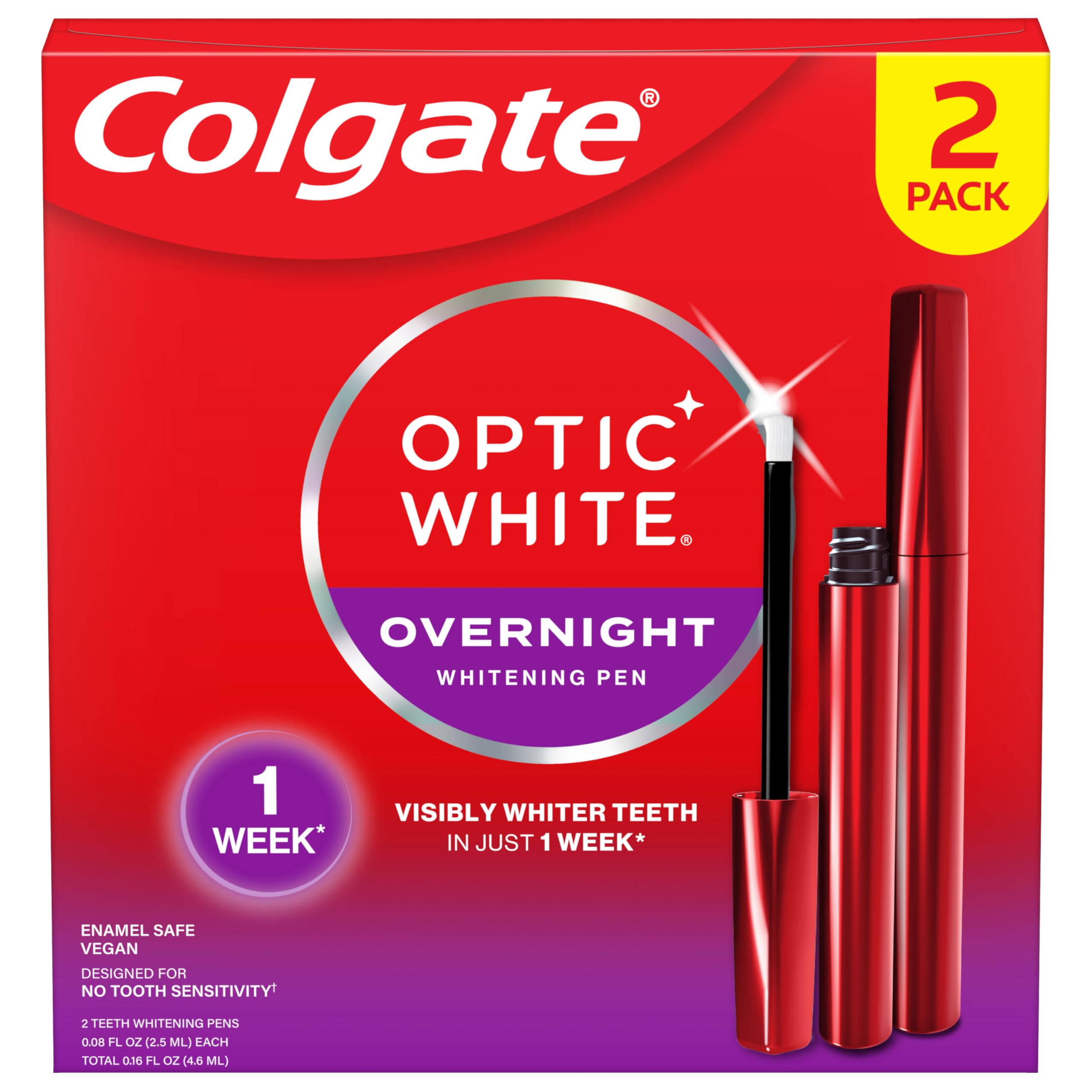 ENAMEL-SAFE TEETH WHITENING PEN: Enamel-safe teeth whitening serum formula designed to minimize tooth sensitivity. REMOVES YEARS OF STAINS IN 1 WEEK: Our advanced whitening technology is fast and effective, use nightly for best results. Each pen has 35 nightly uses, so you can touch-up when you need to. EASY TO APPLY: To use, follow your regular oral care routine, dry your teeth, click the whitening pen, apply a layer onto your teeth, sleep, and brush your teeth in the morning for a brighter smile. OVERNIGHT WHITENING PEN: The Optic White teeth whitener pen features a precision brush to target the surface of each tooth and a clickable top to easily control gel amount. 2 pack of Colgate Optic White Teeth Whitening Pens.