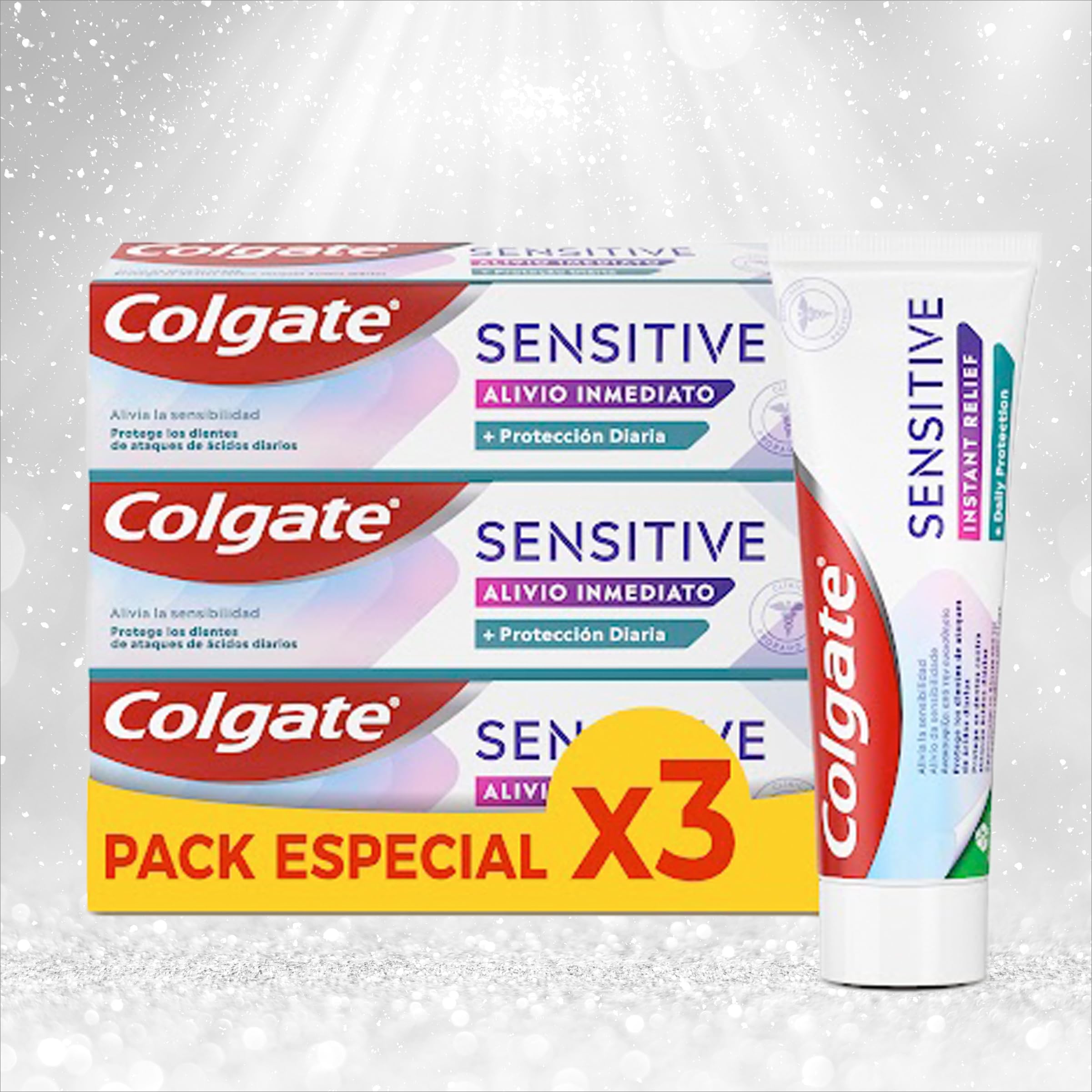 Colgate Sensitive Toothpaste Instant relief Daily protection blocks pain caused by sensitivity . Thanks to its unique Pro-Argin technology, the toothpaste provides immediate relief from sensitivity and helps seal and repair sensitive tooth areas . In addition, it prevents the re-emergence of tooth sensitivity by creating a protective barrier that acts as a sensitive seal . It also restores tooth enamel, making it more resistant to daily aggression. Continuous twice-daily use of toothpaste will provide lasting relief from clinically proven sensitivity for 8 weeks. For immediate relief, apply your finger directly to the sensitive tooth and massage gently for up to 1 minute twice a day. For children 6 to 12 years, once a week or less Continue to use twice a day Continue to use 2 times a day may help prevent teeth from becoming sensitive again INSTRUCTIONS FOR USE Apply Direct Colgate Sensitive Toothpaste Instant relief of the sensitive tooth with the finger and gently massage for 1 minute twice a day. For children aged 6 to 12 years, once a week or less SAFETY WARNING Keep out of the reach of children under 6 years of age. If you swallow more than recommended, consult your doctor or toxicology department. Monitor brushing in children under 7 years of age to minimize intake. See moreEFFECTIVE TIPS FOR TOOTH SENSITIVITY: Continuous use of toothpaste twice a day prevents the onset of sensitivity by creating a protective barrier that acts as a sensitive seal . With continuous use twice a day With continuous use 2 times a day it can help prevent the teeth from reappearing. Proven protection: this toothpaste remineralizes tooth enamel, making it more resistant to daily aggression. ADVANCED TECHNOLOGY - With unique Pro-Argin technology, the toothpaste provides immediate relief from sensitivity and helps seal and repair sensitive tooth areas . For immediate relief, apply your finger directly to the sensitive tooth and massage gently for up to 1 minute twice a day. For children 6 to 12 years, continue to use once a week or less twice a day. Advanced Care: Colgate Sensitive Toothpaste Instant Relief Daily Protection Instantly blocks pain caused by sensitivity. For immediate relief, apply your finger directly to the sensitive tooth and massage gently for up to 1 minute twice a day. Suitable for children aged 6 to 12 years, once a week or less. Advanced care. WHAT YOU GET: Contains three (3) toothpastes Sensitive Instant Relief Daily Protection.Colgate Sensitive Onmiddellijke tandpasta - 3 stuks x 75 ml, dagelijkse bescherming, gevoelige tanden, afdichting en reparatie van gevoelige plekken Colgate Sensitive tandpasta Onmiddellijke verlichting Dagelijkse bescherming blokkeert pijn veroorzaakt door gevoeligheid . Dankzij de unieke Pro-Argin-technologie biedt de tandpasta onmiddellijk verlichting van gevoeligheid en helpt je gevoelige tandgebieden af te dichten en te repareren . Bovendien voorkomt het het opnieuw verschijnen van tandgevoeligheid bij het creëren van een beschermende barrière die fungeert als een gevoelige afdichting . Het herstelt ook het tandglazuur, waardoor het beter bestand is tegen dagelijkse agressie. Door het continu tweemaal daags gebruik van tandpasta krijg je blijvende verlichting van de klinisch bewezen gevoeligheid gedurende 8 weken. Voor onmiddellijke verlichting breng je je vinger direct op de gevoelige tand aan en masseer je zachtjes gedurende maximaal 1 minuut tweemaal per dag. Voor kinderen van 6 tot 12 jaar, eenmaal per week of minder tweemaal per dag blijven gebruiken 2 keer per dag blijven gebruiken, kan het helpen voorkomen dat de tanden weer gevoelig worden GEBRUIKSAANWIJZING Direct Colgate Sensitive tandpasta aanbrengen Directe verlichting van de gevoelige tand met de vinger en masseer zachtjes gedurende 1 minuut tweemaal per dag. Voor kinderen van 6 tot 12 jaar, eenmaal per week of minder VEILIGHEIDSWAARSCHUWING Buiten het bereik van kinderen jonger dan 6 jaar bewaren. Als je meer inslikt dan aanbevolen, raadpleeg dan je arts of toxicologische informatieafdeling. Controleer het borstelen bij kinderen jonger dan 7 jaar om inname te minimaliseren. Meer bekijkenEFFECTIEVE TIPS VOOR TANDGEVOELIJKHEID: Bij continu gebruik van tandpasta tweemaal daags voorkomt het het ontstaan van gevoeligheid bij het creëren van een beschermende barrière die fungeert als een gevoelige afdichting . Bij continu gebruik tweemaal per dag bij continu gebruik 2 keer per dag kan het helpen voorkomen dat de tanden opnieuw verschijnen. Bewezen bescherming: deze tandpasta remineraliseert het tandglazuur, waardoor het beter bestand is tegen dagelijkse agressie. GEAVANCEERDE TECHNOLOGIE - Met de unieke Pro-Argin-technologie biedt de tandpasta onmiddellijk verlichting van gevoeligheid en helpt het gevoelige tandgebieden af te dichten en te repareren . Voor onmiddellijke verlichting breng je je vinger direct op de gevoelige tand aan en masseer je zachtjes gedurende maximaal 1 minuut tweemaal per dag. Voor kinderen van 6 tot 12 jaar, eenmaal per week of minder tweemaal per dag blijven gebruiken. Geavanceerde verzorging: Colgate Sensitive tandpasta Onmiddellijke verlichting Dagelijkse bescherming blokkeert pijn veroorzaakt door gevoeligheid onmiddellijk. Voor onmiddellijke verlichting breng je je vinger direct op de gevoelige tand aan en masseer je zachtjes gedurende maximaal 1 minuut tweemaal per dag. Geschikt voor kinderen van 6 tot 12 jaar, eenmaal per week of minder. Geavanceerde verzorging. WAT JE KRIJGT: Bevat drie (3) tandpasta's Gevoelige onmiddellijke verlichting Dagelijkse bescherming.
