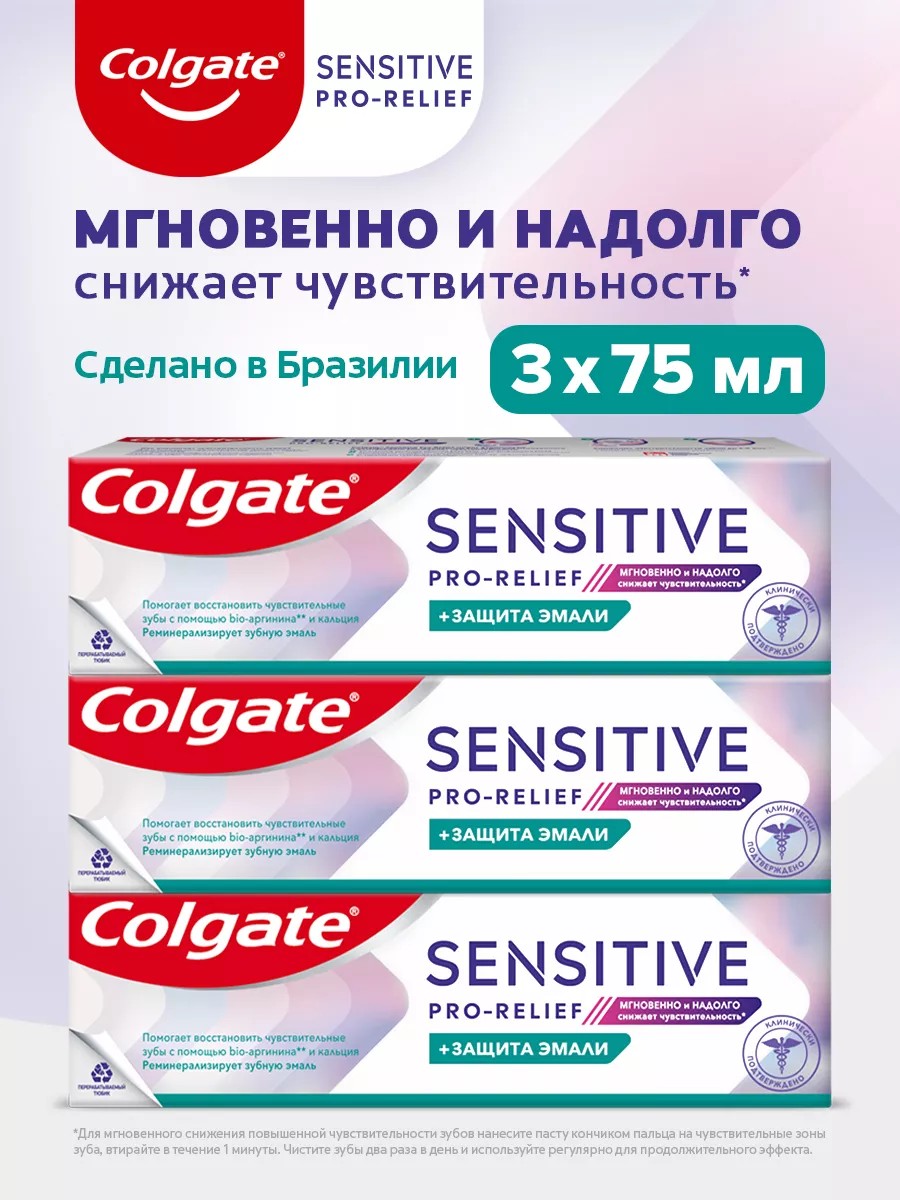 Встречайте обновленный набор для зубов Colgate Sensitive Pro-Relief Защита Эмали, 75 мл защита эмали для снижения чувствительности зубов! Как возникает чувствительность зубов? При опускании десен и повреждении эмали оголяются тысячи микроскопических канальцев, ведущих к нервным окончаниям зуба.Оголенные канальцы дентина вызывают чувствительность зубов. Технология Pro-Argin уплотняет/запечатывает открытые дентинные канальцы для мгновенного снижения* чувствительности. *Для мгновенного снижения повышенной чувствительности зубов нанесите пасту кончиком пальца на чувствительные зоны зуба, втирайте в течение 1 минуты