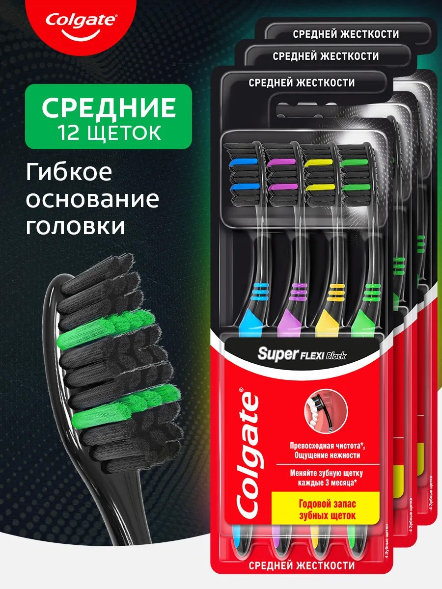 Зубная щетка Colgate Super Flexi Black средней жесткости отличается от остальных щеток своей гибкой головкой, которая оказывает меньше давления на дёсны, при этом сохраняя качество чистки.