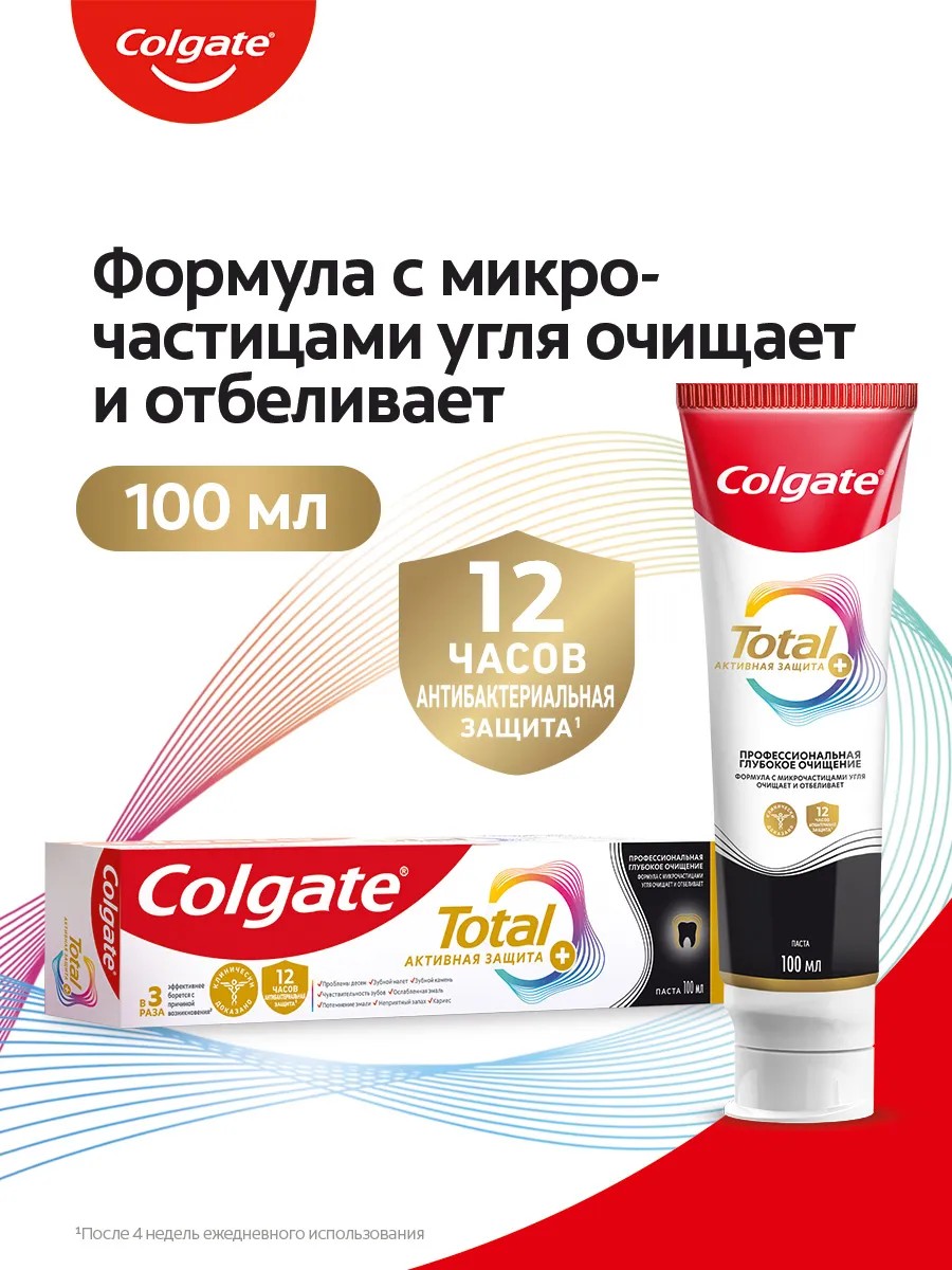 Клинически доказано: Усовершенствованная формула зубной пасты Colgate Total Активная Защита+ Профессиональная Глубокое Очищение имеет формулу с микрочастицами угля для очищения и отбеливания и в 3 раза эффективнее борется с причиной возникновения² основных проблем полости рта.