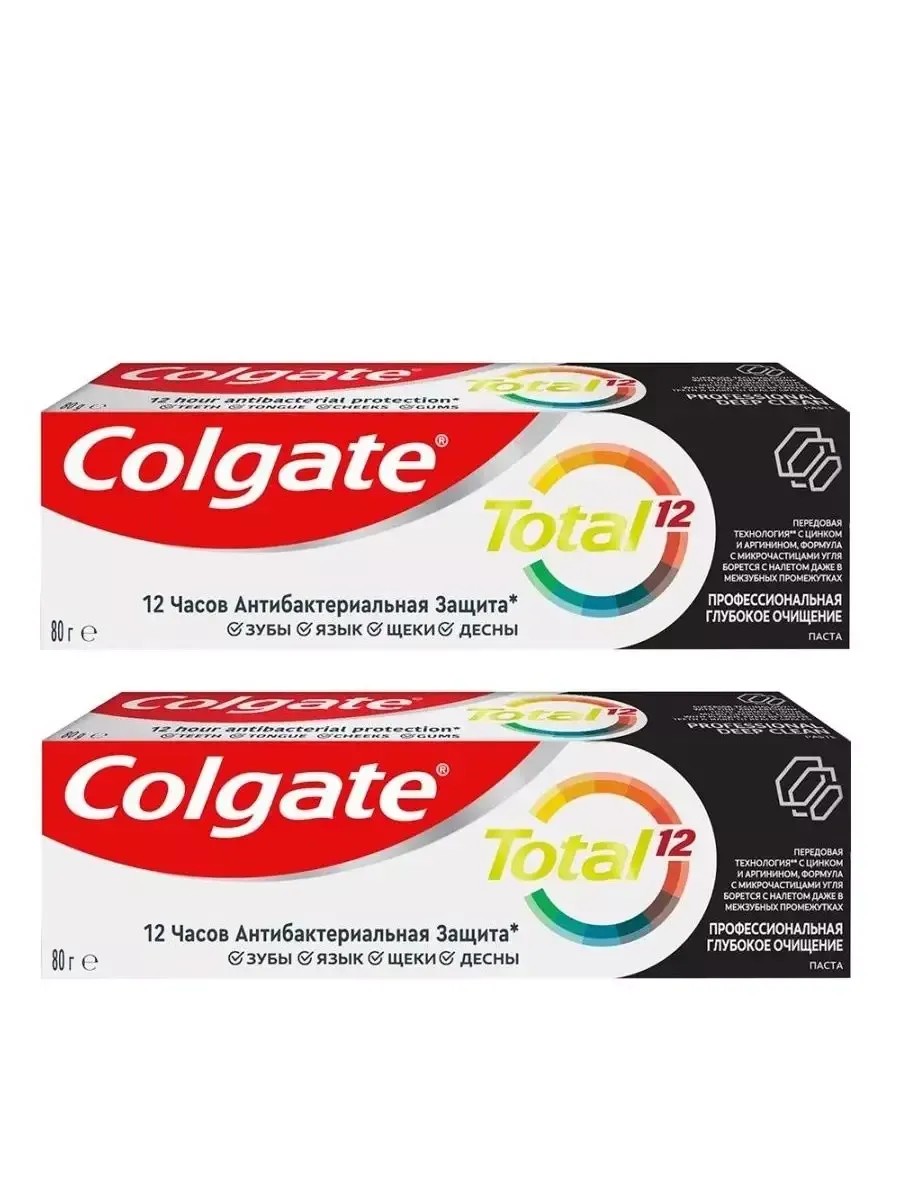 Зубная паста Colgate Total 12 Профессиональная Глубокое Очищение содержит микрочастицы угля, которые проникают даже в межзубные промежутки и борются с налетом! Паста не только борется с бактериями на зубах, но и на языке, щеках и деснах и защищает их в течение 12 часов. Передовая формула с Цинком и Аргинином обеспечивает защиту всей полости рта. Цинк борется с бактериями, создавая защитный минеральный барьер, а аргинин ослабляет структуру зубного налета и улучшает проникновение цинка. Паста обеспечивает превосходную защиту от налета, признаков воспаления десен при борьбе с бактериями, нейтрализацию неприятного запаха изо рта, защиту от разрушения эмали, повышенной чувствительности зубов, кариеса, налета, зубного камня, потемнений на эмали и проблем с деснами.