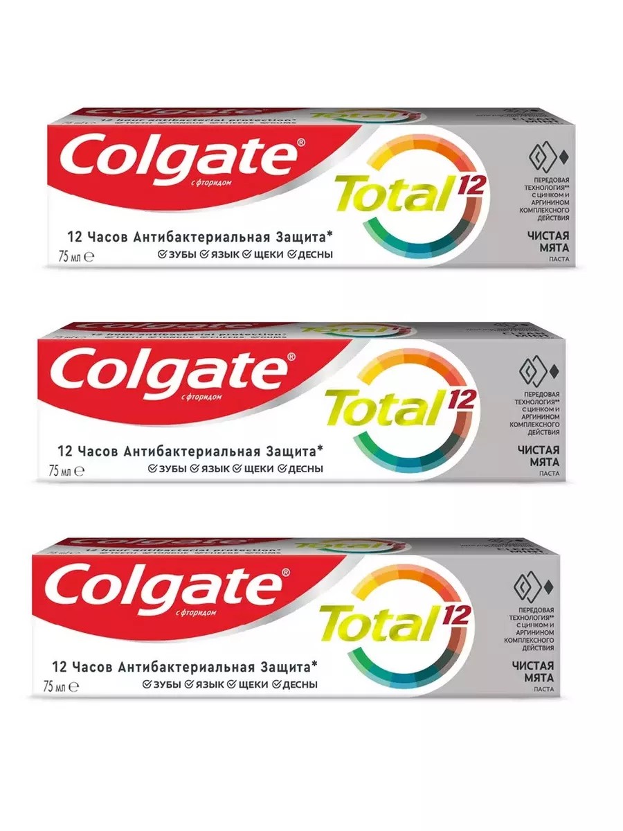 Комплект 3 штуки. Colgate Зубная паста Total 12 Чистая мята, 75 мл. Зубная паста Colgate Total 12 с прекрасным мятным вкусом придаёт ощущение чистоты и свежести, обеспечивает комплексную защиту полости рта. Паста, созданная на основе уникальной технологии с клинически подтверждённой эффективностью, защищает зубы, щёки и дёсны от бактерий в течение 12 часов. Средство обеспечивает превосходную защиту всей полости рта: расщепляет зубной налёт, борется с бактериями и устраняет признаки воспаления дёсен.Мгновенно нейтрализует неприятный запах изо рта, защищает от разрушения и потемнения эмали, кариеса, зубного камня, предотвращает повышенную чувствительность зубов.