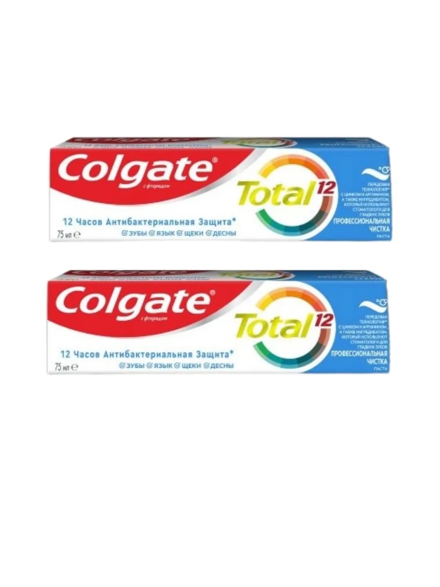 Colgate, зубная паста total профессионал , 75 мл., 2 шт. Передовая формула Colgate Total борется с бактериями не только на зубах, но и на языке, щеках и деснах и защищает всю полость рта в течение 12 часов. Создает защитный минеральный барьер с цинком и аргинином для всей полости рта. А также обеспечивает мгновенную нейтрализацию неприятного запаха изо рта, активную защиту эмали и борется с чувствительностью зубов. При ежедневном использовании в течение 4 недель.