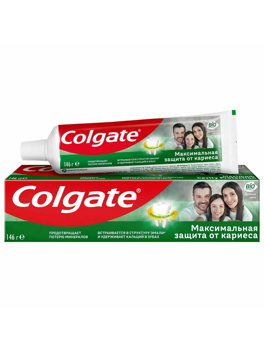 Colgate Maximum Cavity Protection Toothpaste, Double Mint, 100 ml. A unique formula with liquid calcium and fluoride protects and strengthens tooth enamel from all sides, penetrating even hard-to-reach areas of the oral cavity. Ingredients: Calcium Carbonate, Water, Sorbitol, Hydrated Silica, Sodium Lauryl Sulfate, Sodium Monofluorophosphate, Flavor, Cellulose Gum, Magnesium Aluminum Silicate, Sodium Carbonate, Benzyl Alcohol, Sodium Saccharin, Sodium Bicarbonate, Limonene; Toothpaste action: Protection against caries;