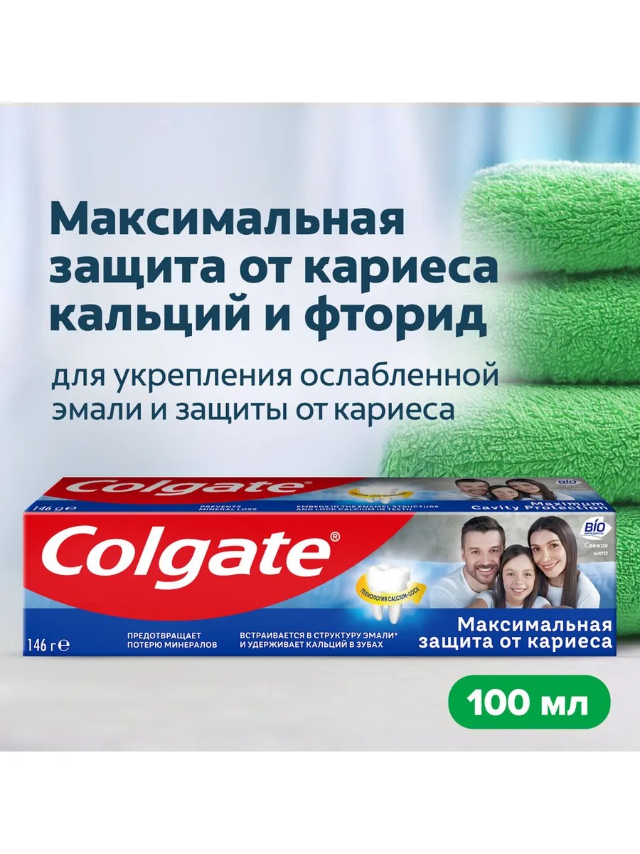 Кариес чаще всего возникает в труднодоступных для чистки местах полости рта. Зубная паста Colgate «Максимальная Защита от кариеса» с жидким кальцием и фтором поможет вам справиться с этой проблемой. Уникальная формула с технологий Calcium-lock встраивается в структуру эмали и удерживает кальций в зубах, укрепляя ослабленную эмаль и защищая зубы от кариеса со всех сторон. Зубная паста "Максимальная защита от кариеса" помогает предотвратить потерю минералов и сохранить зубы крепкими изнутри. Удаляет зубной налет, бережно восстанавливает белизну зубов. Приятный мягкий мятный вкус Colgate «Максимальная Защита от кариеса Свежая Мята» надолго освежит дыхание. BIO в отношении ингредиентов в составе означает их натуральность. Произведено с заботой, чтобы Вы могли чаще улыбаться! #продолжайулыбаться