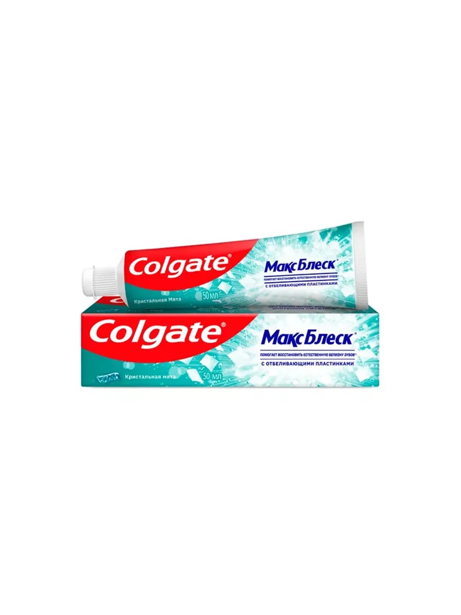 Colgate. Зубная паста с отбеливающими пластинками Макс Блеск, кристальная мята, 100мл. Отбеливающая зубная паста Colgate Макс Блеск не только сделает ваши зубы белее, но и подарит невероятное ощущение свежести для еще большей уверенности в себе.