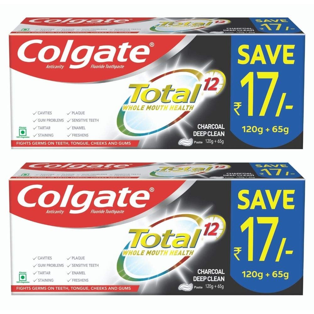Only 20 of the germs in your mouth are on your teeth, the rest 80 are on gums, tongue and cheeks. Colgate Total Charcoal Deep Clean is an antibacterial toothpaste with dual Zinc arginine technology that actively seeks out bacteria and fights germs on teeth, tongue, cheeks, and gums, giving you Whole Mouth Clean for 12 hours. It is infused with micro-charcoal particles to provide a deep clean. Colgate Total provides more benefits than before - helping prevent cavities, plaque build-up, tartar formation, gingivitis and sensitivity. It gives you fresh breath , protects your enamel, and removes stains, giving you a healthier, whiter smile Colgate is India's Most Trusted oral care brand and is IDA certified. This toothpaste is 100 vegetarian, sugar-free and gluten-free and responsibly made.This toothpaste is made in India, in our manufacturing unit that is awarded with True Zero Waste Platinum CertificationThis pack has 2 x 185g tubes of 100 Vegan, Sugar-free and Gluten free toothpaste. This toothpaste has charcoal that provides a Deep Clean. The Dual-Zinc Arginine formula toothpaste also protects against cavities, plaque, , sensitive teeth, tartar, enamel damage, staining, gingivitis and bad breath. Recommended usage: Brush thoroughly for 2 minutes, twice a day. Children below the age of 6 to have adult supervision. Colgate is India s most trusted oral care brand and certified by Indian Dental Association.