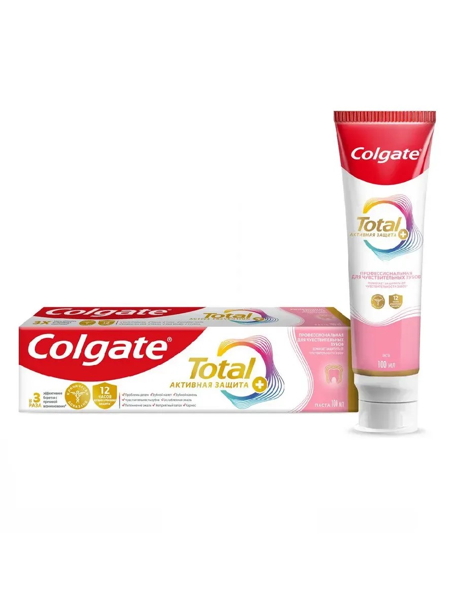 Colgate Зубная паста Total для чувствительных зубов, 100мл. Клинически доказано: Усовершенствованная формула зубной пасты Colgate Total Активная Защита+ Профессиональная Для Чувствительных Зубов помогает защитить зубы от чувствительности и в 3 раза эффективнее борется с причиной возникновения основных проблем полости рта. Быстродействующая, уникальная формула помогает защитить зубы от чувствительности с 1 дня. Фторид олова осаждается на открытых поверхностях зубов, снижая их чувствительность. Кремообразная паста без содержания SLS образует густую пену, которая бережно ухаживает за чувствительными зубами. Нежный уход за чувствительными зубами и минимальное охлаждение. 12 часов Антибактериальная Защита