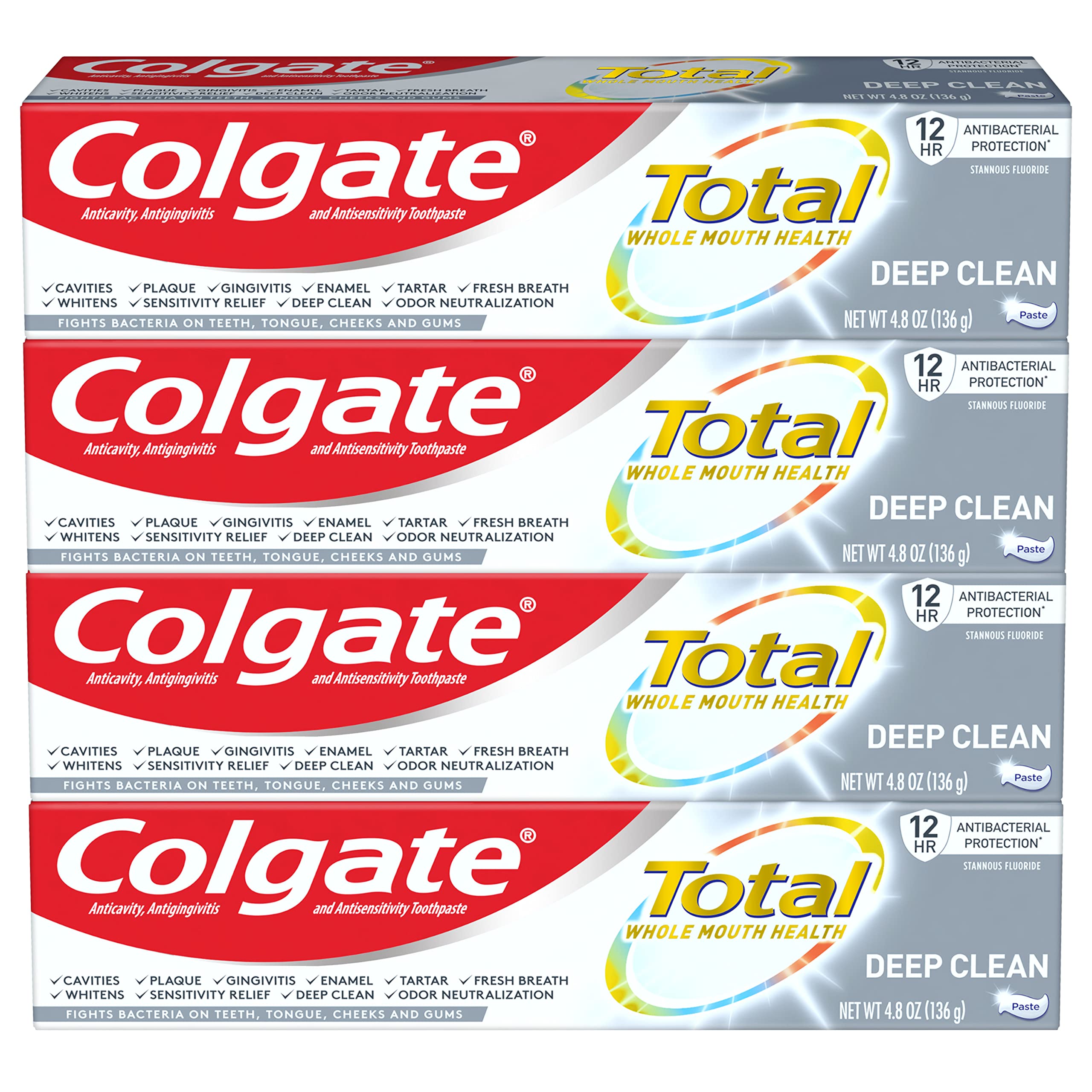 This Deep Clean mint toothpaste leaves your mouth feeling clean and your breath refreshed. Use Colgate Total Deep Clean toothpaste to remove surface stains for a whiter, brighter smile. Get 10 benefits and no trade-offs with Colgate Total toothpaste. Colgate Total Deep Clean Toothpaste offers 42 more sensitivity relief ( versus a regular fluoride toothpaste after 8 weeks of use). Includes four (4) 4.8 oz tubes of Colgate Total Deep Clean Toothpaste, Teeth Whitening Toothpaste.