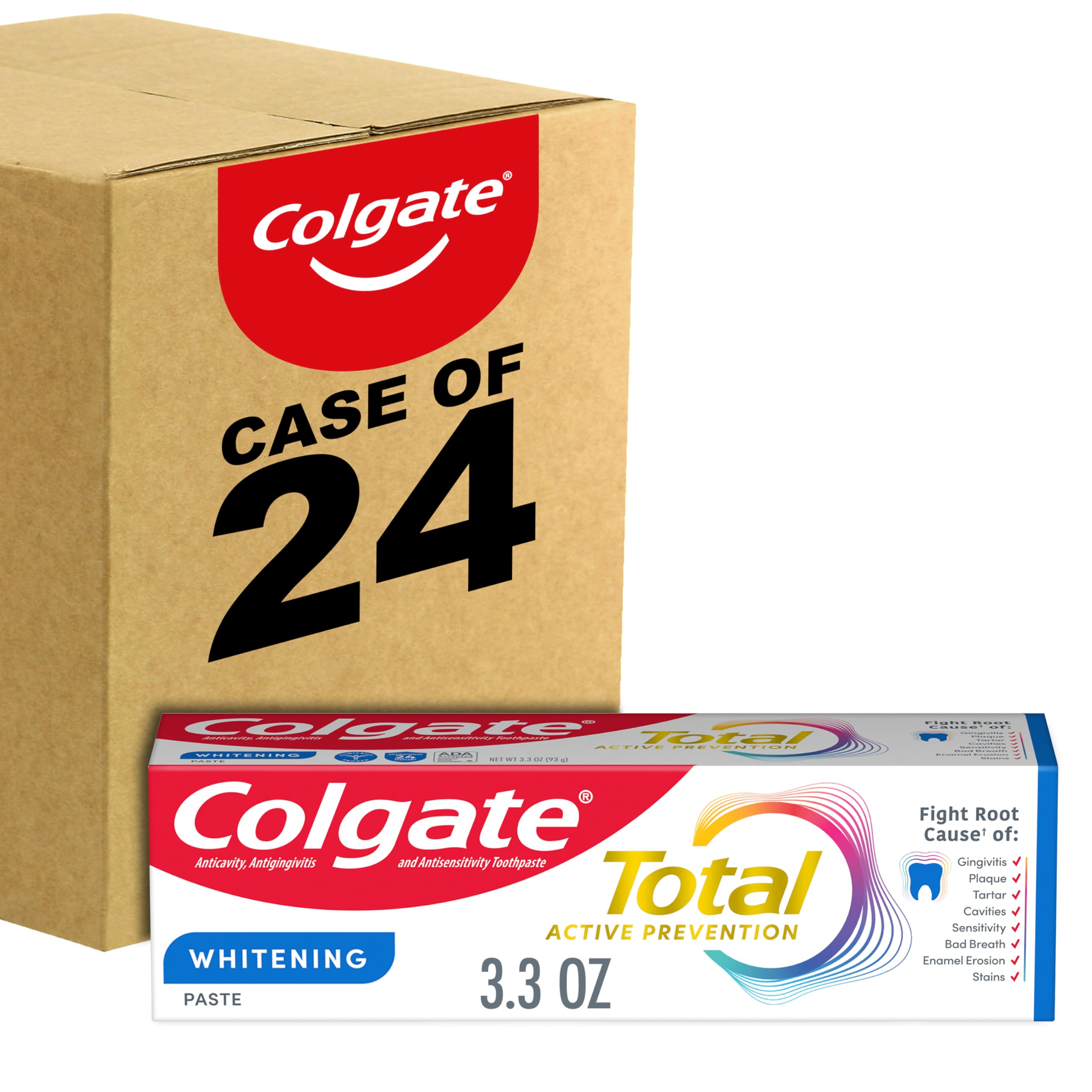 Now with Relief for Sensitive Teeth. This mint toothpaste leaves your mouth feeling clean and your breath refreshed. Use Colgate Total Whitening toothpaste to remove surface stains for a whiter, brighter smile. Get 10 benefits and no trade-offs with Colgate Total toothpaste. Colgate Total Whitening Toothpaste offers 42 more sensitivity relief ( versus a regular fluoride toothpaste after 8 weeks of use). Includes one (24) 3.3 oz tube of Colgate Total Whitening Toothpaste, Teeth Whitening Toothpaste.