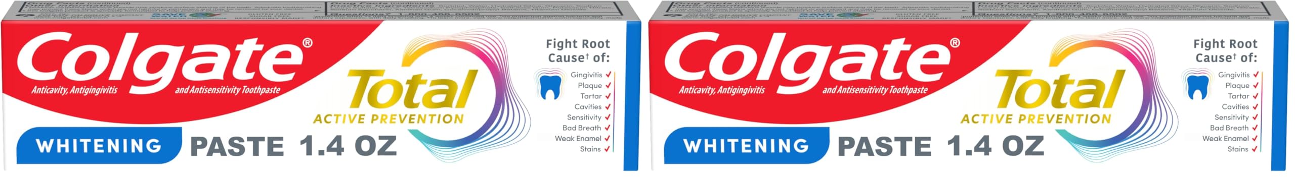FIGHTS MULTIPLE ISSUES: Fights root cause of gingivitis, plaque, tartar, cavities, sensitivity, bad breath, enamel erosion, stains. 24 HOUR ANTIBACTERIAL TOOTHPASTE: Provides 24 hour antibacterial protection with twice daily brushing . ROOT CAUSE PROTECTION: Clinically proven to target the root cause of common oral health issues . BE DENTIST READY: Helps stop oral care problems like gingivitis and cavities before they start. TRAVEL SIZE WHITENING TOOTHPASTE: Includes one 1.4 oz tube of Colgate Total Active Prevention Travel Toothpaste, Mint. The information below is per-pack only.