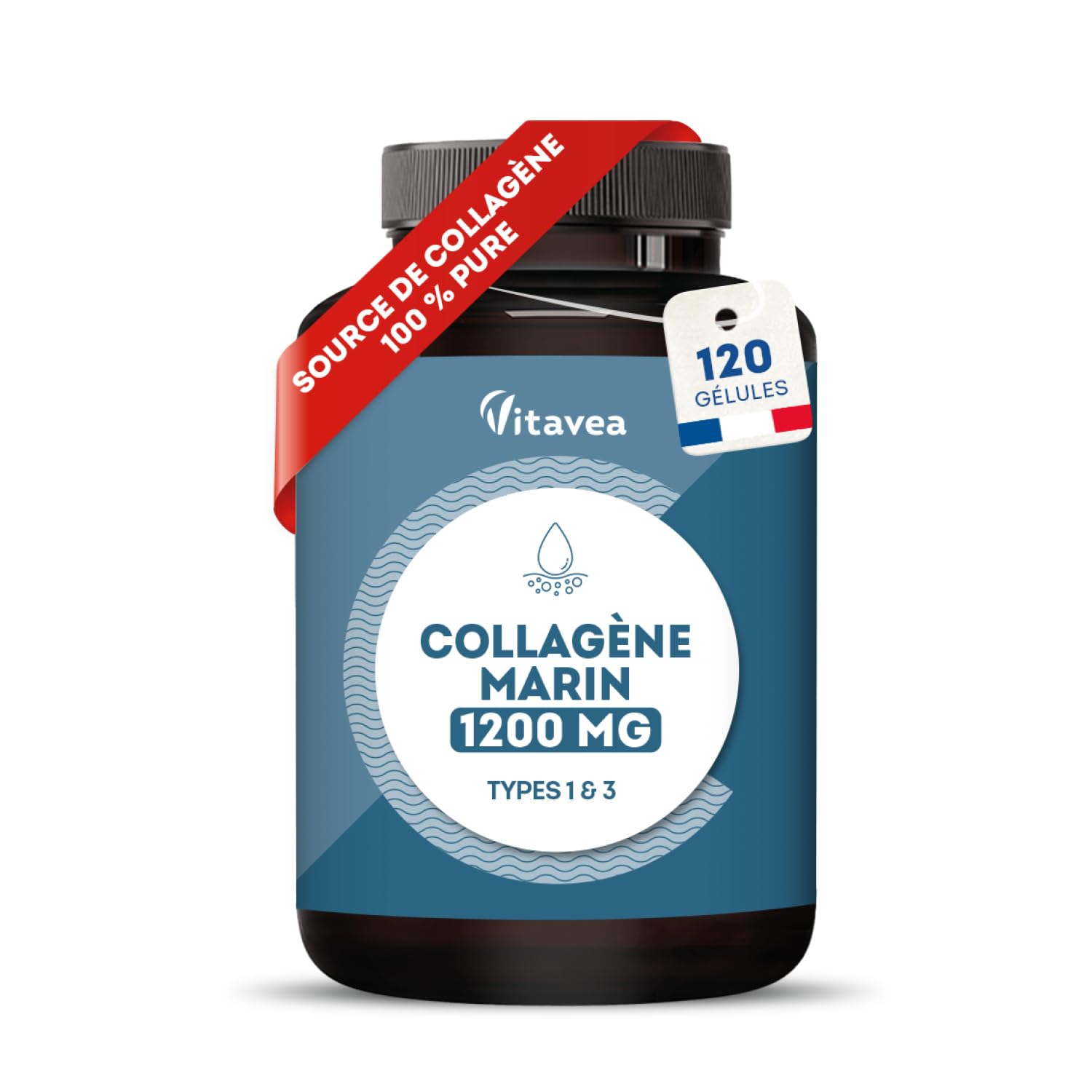 Collagène Marin Hydrolysé 1200 mg - Source de Collagène 100 Pure, Types I III - 120 gélules - Peptides de Collagène Hydrolysé - Élasticité Fermeté de la Peau - Fabriqué en France - Vitavea