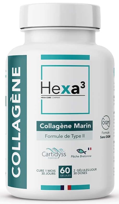 Marine collagen made in France and sourced from Breton fisheries. Type 2 marine collagen, Cartidyss certified. Two clinical studies on wrinkle reduction and joint pain reduction.Collagene marin made in france et issu de la pêche bretonne. Collagene marin de type 2 labelisé cartidyss. 2 études clinique sur la reduction des rides et réduction des douleurs articulaires.Collagène Marin type 2 labelisé Cartidyss 60 Gelules