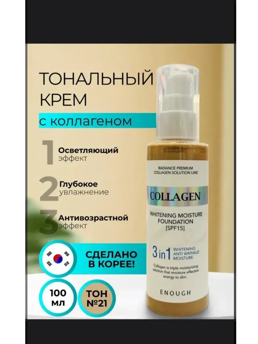 Увлажняющий тональный крем с коллагеном Collagen Enough Moisture Foundation обеспечивает защиту от солнца spf 15. Прекрасно ложится на кожу, увлажняет и питает её. Увлажнение, антивозрастной эффект, отбеливание - 3 свойства в одном флаконе. Основа помогает скрыть любые несовершенства кожи, такие как следы от прыщей, покраснений и пигментации. Защитный с spf является также антивозрастной. Он не плотный и обладает легким покрытием, при этом стойкий. Не сушит кожу и придает лицу здоровое сияние. Коллаген разгладит структуру кожи и выровняет тон. Экстракт центеллы азиатской окажет противовоспалительное и ранозаживляющее действие. Тональное средство с спф представлено в двух оттенках: светлый №13 слоновая кость и цвет №21 бежевый. Применение: тональник нанести на увлаженную кожу. Благодаря этому средство ложится тонким ровным слоем и не забивает поры. Выравнивающий и защитный, он помогает не только скрыть несовершенства кожи, но и оказывает лифтинг эффект. Используя крем можно добиться как эффекта сияние, так и матовый финиш макияжа. Тонирующий и матирующий крем корейский подходит как для сухой, чувствительной и нормальной кожи, так и для жирной, комбинированной, проблемной и возрастной кожи. Профессиональная косметика для лица и тела - ваш уход и здоровье. Оригинальная корейская косметика уходовая из Кореи для женщин. Чтобы проверить подлинность, отсканируйте QR код на упаковке.