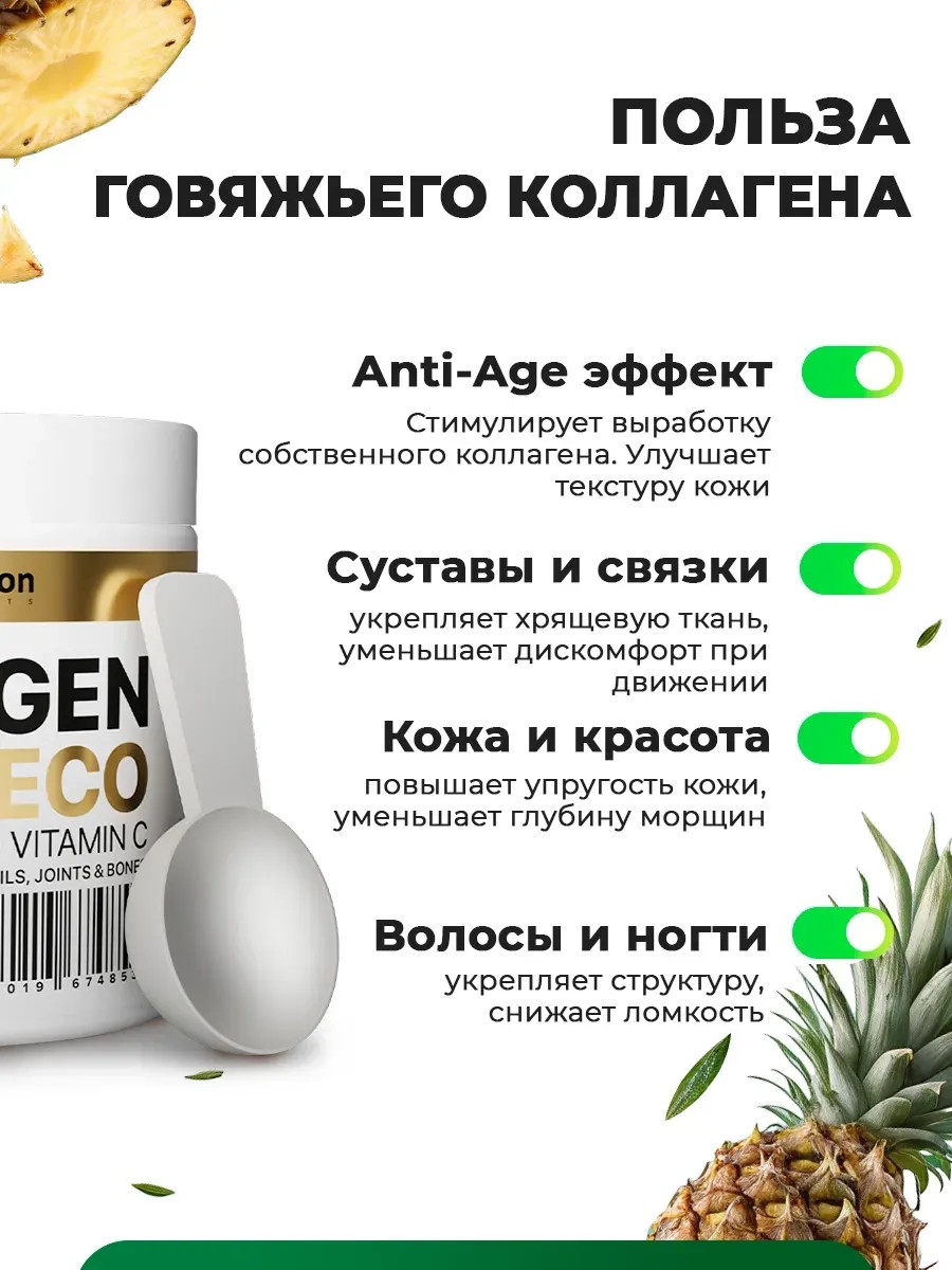 Порошок Коллаген (Collagen) гидролизованный говяжий первого и третьего типа с аскорбиновой кислотой и гиалуроновой кислотой, представленный в биологически доступной форме пептидов (в порошке). Этот продукт имеет биологически доступную форму пептидов и представляет собой эффективное средство для поддержания эластичности и упругости кожи. Ежедневное употребление коллагена способствует эластичности и упругости кожи, уменьшает и разглаживает морщинки. Восстанавливает структуру волос и ногтей. Замедляет процессы старения, а также укрепляет здоровье костей, связок и суставов. Принимать коллаген нужно вместе с витамином C, который уже идет в составе, поэтому дополнительные добавки вам не нужны. Витамин С улучшает усвоение коллагена, повышает его эффективность. Гиалуроновая кислота ускоряет регенерацию тканей и положительно сказывается на Вашей красоте и здоровье. 100% натуральный гидролизованный говяжий коллаген. Он содержится во всем организме и обеспечивает важную инфраструктуру как внутри, так и снаружи. Продукт имеет высокую степень усвояемости и отвечает в организме за упругость кожи, эстетичный вид ногтей и волос. Прочность суставов, эластичность связок, метаболизм, защиту сердечно-сосудистой системы и функции печени. Витамин С участвует в синтезе коллагена и является антиоксидантом. Коллаген порошок для суставов является отличным подарком для женщин. Он поможет маме, бабушке, сестре или девушке сохранить молодость и красоту. Кроме того, этот продукт также подходит для людей, занимающихся спортом, так как он способствует укреплению суставов и связок. Рекомендации: смешать 1 мерную ёмкость (6 г.) продукта с 100 мл. прохладной воды/сока. Для достижения оптимального эффекта принимать ежедневно 1-2 раза в день.Не является лекарствтенным средством.