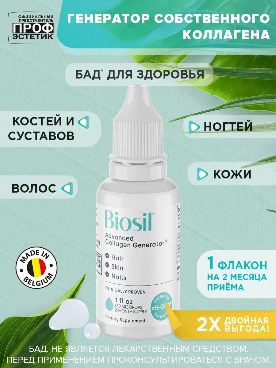 Синтез утраченного коллагена стал реальным: комплекс стабилизированной холином ортокремниевой кислоты ch-OSA в составе БИОСИЛ (Biosil) путем естественной стимуляции помогает выработать и обеспечить организм тремя «протеинами красоты», ведь состояние кожи, волос и ногтей зависит именно от них, помогая выглядеть моложе. Коллаген придает коже эластичность, предотвращает возникновение мелких и глубоких морщин. Придает волосам густоту, объем, силу. Укрепляет ногти. Кроме того, он необходим для здоровья костей и суставов. Способность генерировать коллаген с отпечатком собственной ДНК сделало Biosil настоящим прорывом в области исследований коллагена. Biosil - первый и единственный в мире натуральный генератор собственного коллагена.