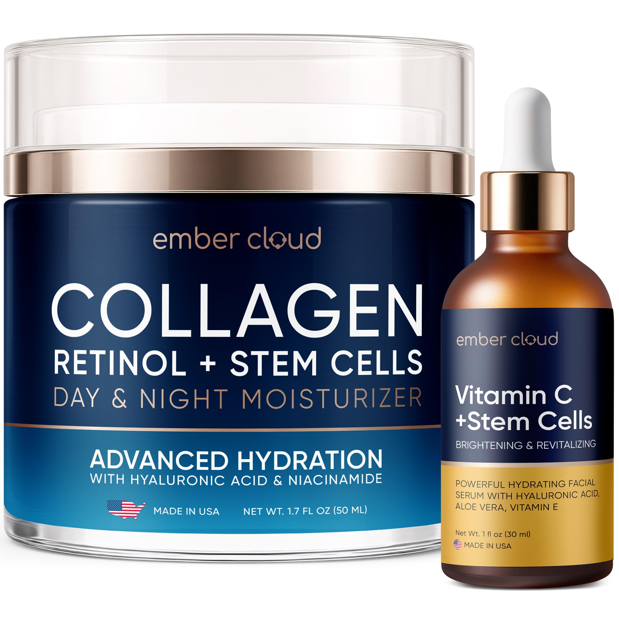Collagen Cream for Face with Stem Cells Retinol Hyaluronic Acid Niacinamide (1.7 Oz) Vitamin C Serum for Face (1Oz)