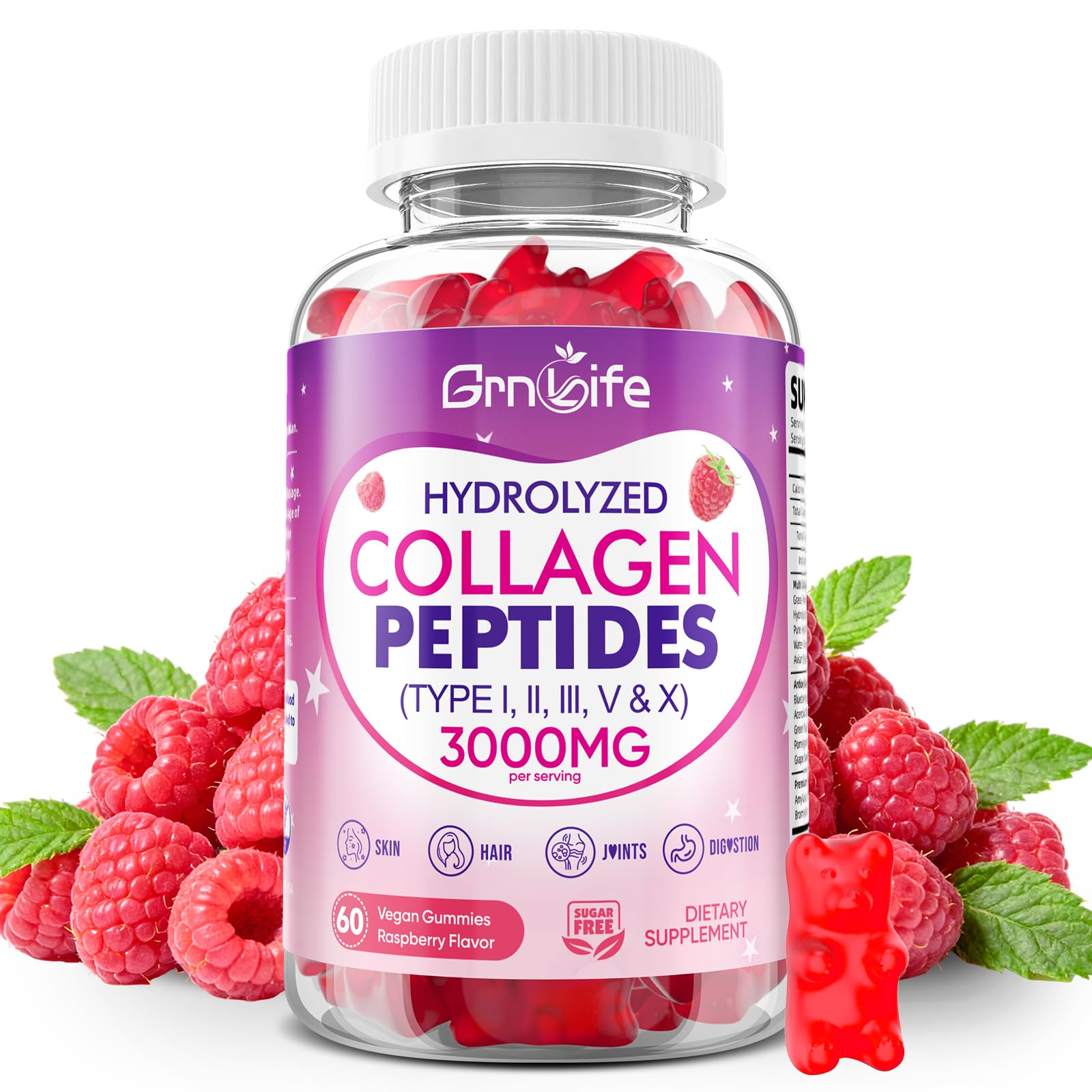 Excellent in Quality: Grnlife hydrolyzed collagen gummies comply with GMP standards and have passed laboratory testing. All batches of the product undergo quality assurance at every stage of production. We are always committed to producing the highest quality dietary supplements and being your health partner. Ideal for Men and Women: The collagen peptide gummies are suitable for both men and women. They have a comfortable texture after chewing and can be swallowed without water or food, allowing for quick absorption by the digestive system and gentle on the stomach. Each bottle contains 60 gummies, providing a 30-day supply. 5X Faster Absorption: Each serving has 3000mg hydrolyzed multi-collagen peptides for 5 times better absorption, this form is quickly utilized by your body—working fast to support renewal, elasticity, and hydration. Get the most from every gummy for that radiant, youthful effect. Antioxidant Complex Formula: West Indian cherry vitamin C synergizes with blueberries to promote collagen production, while green tea boosts metabolism. Enriched with pomegranate and grape seed extracts, these collagen peptide gummies deliver powerful antioxidant defense against aging for comprehensive beauty care. Collagen Peptides for Radiant Skin: Multi-hydrolyzed collagen (types I, II, III, V, and X) breaks down into smaller collagen peptides that are directly absorbed by the intestines. This collagen gummies supplies the body with essential amino acids to promote collagen synthesis, support anti-aging, and maintain healthy hair, skin, and nails.