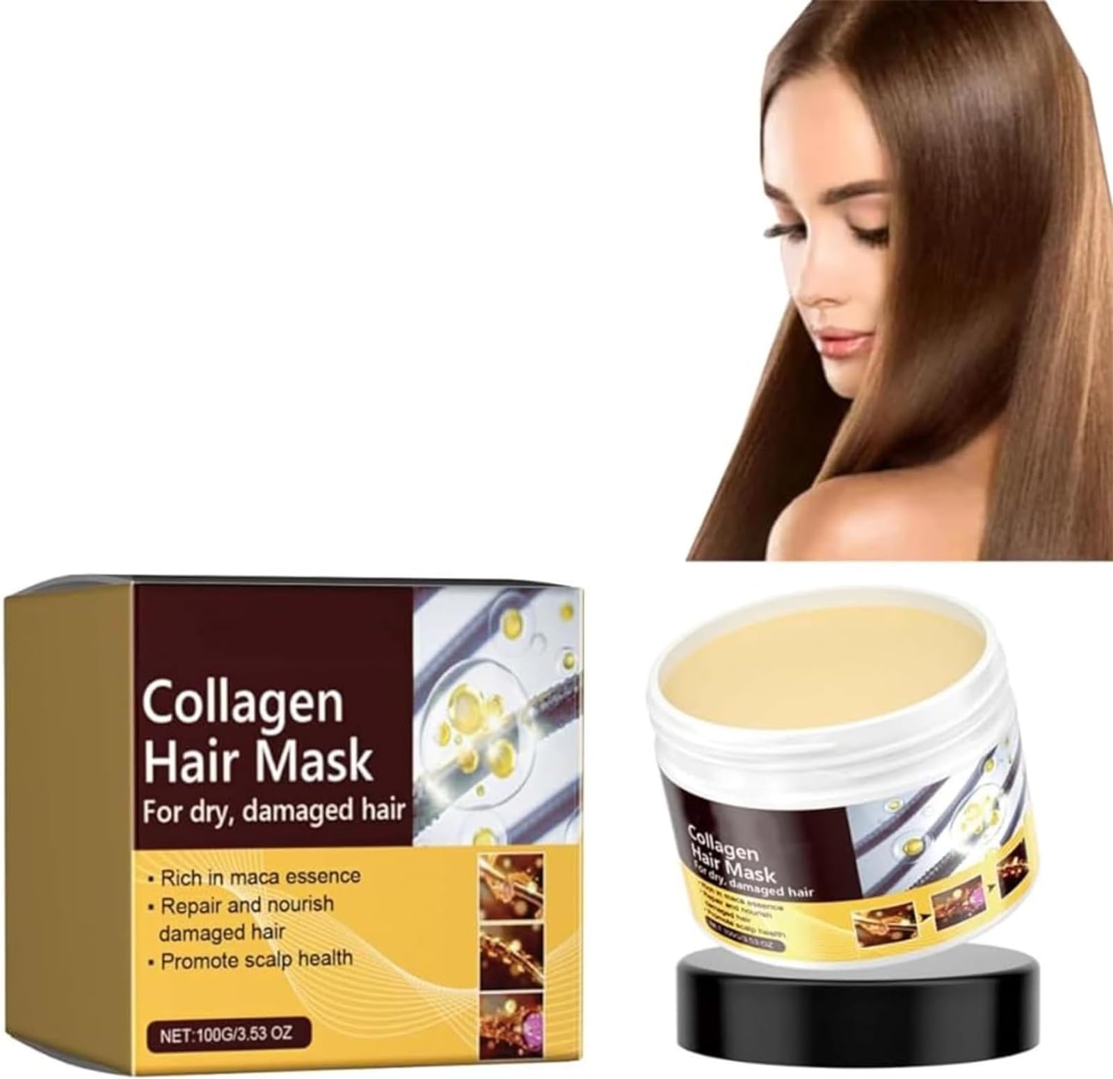 Product Name: Collagen Hair Mask Essence Net weight: 100g Gross weight: 120g Product size: 5.5 5.5cm Product packaging: 1 2 3PCSx Collagen Repair Hair MaskFor All Hair Types Whether you have curly, straight, or color-treated hair, our collagen hair treatment is perfect for all hair types, providing the care and nutrition your hair needs. Enhances Shine and Smoothness Experience shiny, smooth locks with our hair treatment. It enhances shine and leaves your hair silky-smooth and manageable. Restore Dry and Damaged Hair Say goodbye to brittle and weak strands. Our treatment restores elasticity, making your hair stronger and less prone to breakage. Deep Hydration Infused with nourishing ingredients like coconut oil collagen, this treatment provides deep hydration to revitalize and replenish your hair. Restorative Keratin Essence: Our collagen hair treatment with argan oil is specially formulated to repair and strengthen dry, damaged, and over-processed hair. Nom du produit : Essence de masque capillaire au collagène Poids net : 100g Poids brut : 120g Taille du produit : 5,5 5,5 cm Emballage du produit : 1 2 3PCSx Masque capillaire réparateur au collagènePour tous les types de cheveux Que vous ayez des cheveux bouclés, raides ou colorés, notre traitement capillaire au collagène est parfait pour tous les types de cheveux, fournissant les soins et la nutrition dont vos cheveux ont besoin. Améliore la brillance et la douceur Faites l'expérience de mèches brillantes et lisses avec notre traitement capillaire. Il améliore la brillance et laisse vos cheveux soyeux et faciles à coiffer. Restaurez les cheveux secs et abîmés Dites adieu aux mèches cassantes et faibles. Notre traitement restaure l'élasticité, rendant vos cheveux plus résistants et moins sujets à la casse. Hydratation en profondeur Infusé d'ingrédients nourrissants comme le collagène d'huile de noix de coco, ce traitement procure une hydratation en profondeur pour revitaliser et reconstituer vos cheveux. Essence de kératine réparatrice : notre traitement capillaire au collagène avec de l'huile d'argan est spécialement formulé pour réparer et renforcer les cheveux secs, abîmés et trop traités.