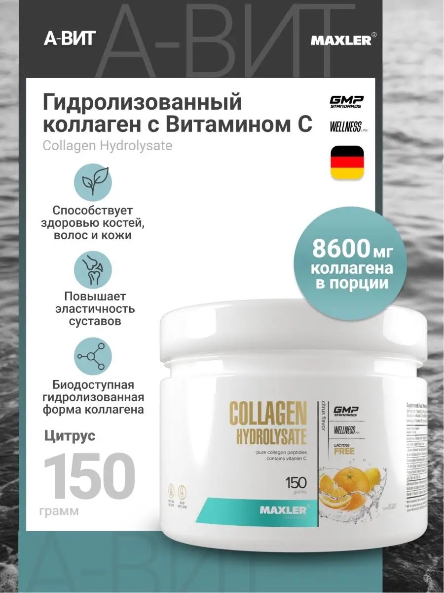 Коллаген гидролизованный Витамин С Макслер 150 гр в порошке со вкусом цитруса. Синтез коллагена снижается с возрастом, поэтому важно следить за тем, чтобы он был получен с питанием или пищевыми добавками. Компания Макслер разработала продукт Maxler Collagen Hydrolysate with Vitamin C в порошке со вкусом, который содержит эффективную форму коллагена - гидролизованный коллаген. Гидролизованный коллаген 1 и 3 типа в сочетании с Витамином С бренда Макслер является идеальным фундаментом для соединительной ткани человека. Говяжий коллаген порошок питьевой способствует улучшению структуры кожи, волос и ногтей, важен для здоровья костей и суставов, облегчает регенерацию тканей после повреждений. Коллаген порошок с витамином с стимулирует синтез коллагена, а также способствует антиоксидантной защите, замедляет процессы старения. Гидролизованные пептиды коллагена повышают биодоступность продукта. Коллаген в порошке Maxler может стать надежным источником гидролизованного коллагена. Преимущества говяжьего коллагена с витамином Ц: профилактика травм, укрепляет опорно-двигательный аппарат, улучшает состояние кожи, содержит витамины и минералы, - усиление регенерации соединительной ткани. Порошковый коллаген для приема внутрь подходит и обычным людям для профилактики и укрепления организма, а также для спортсменов, которые усиленно тренируются и хотят обеспечить здоровье тела. Коллаген порошок для суставов отлично заменяет коллаген в таблетках, капсулах и сыворотках, он активно насыщает мышцы притоком аминокислот. Может применяться как пищевая добавка, которая ускоряет рост мышц. Питьевой коллаген порошок для суставов и связок поможет быстро восстановиться после усиленных и интенсивных тренировок, он подходит для женщин и мужчин. Коллаген порошок питьевой усиленный витамином С поможет укрепить сухожилия, связки, хрящи и улучшить состояние вашей кожи. ** Рекомендации по применению**: Для получения одной порции смешайте 1 мерную ложку - 10 гр порошка - с 200-250 мл воды.
