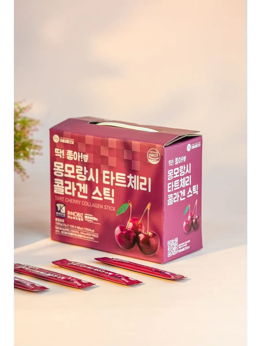 MIPPEUM Tart Cherry Collagen Jelly Sticks are a delicious and healthy Korean dietary supplement in jelly stick format. Each sachet contains 1600 mg of low-molecular-weight fish collagen, which is easily absorbed by the body. Collagen jelly helps maintain skin firmness and elasticity and helps maintain healthy joints and ligaments. The formula is supplemented with Montmorency sour cherry extract, which contains natural antioxidants, including anthocyanins, vitamin A, and beta-carotene.