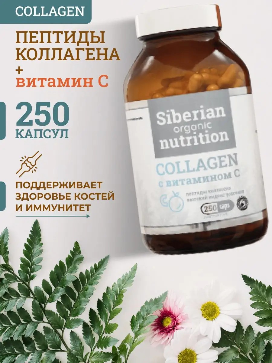 Полезный эффект коллагена, способствует сохранению и продлению молодости кожи. Белок положительно сказывается не только на внешнем виде, но и является компонентом, необходимым для полноценного функционирования суставов и мышечных тканей, сосудов и сухожилий. Нарушение естественного цикла коллагенового синтеза — один из основных факторов, обуславливающих развитие патологий опорно-двигательного аппарата и сердечно-сосудистой системы. Состав: коллаген гидролизованный говяжий 470 мг, витамин С 30 мг, растительная капсула.Пептиды коллагена лучше усваиваются организмом, кроме того: помогают восстанавливать поврежденные ткани; обеспечивают структурную поддержку и питание кожи, волос и ногтей; улучшают здоровье суставов; защищают хрящи от разрушения и помогают уменьшить воспаление; стимулируют выработку коллагена и синовиальной жидкости; поддерживают здоровье костей;Инструкция по применению: принимать по 2 капсулы 3 раза в день перед приемом пищи. При наличии заболеваний суставов, связок и прочих нарушений опорно-двигательного аппарата, увеличить суточный прием до десяти капсул в день. Оптимальный курс приема 3 месяца. Форма выпуска: растительная капсула 250 штук в упаковке. Противопоказания: индивидуальная непереносимость, детский возраст до 16 лет.