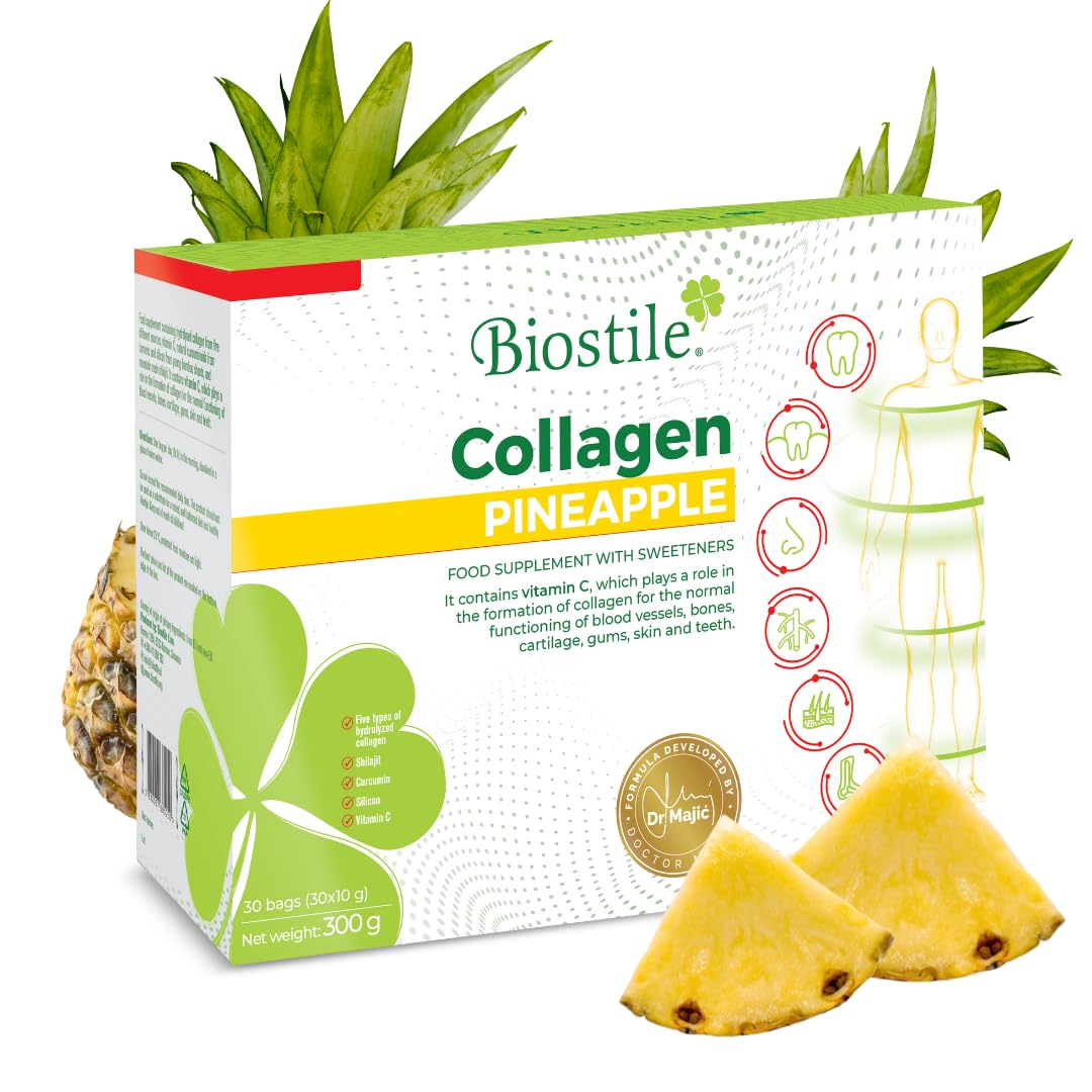 Pineapple Collagen – High-quality collagen with a refreshing pineapple flavor. Pineapple Collagen combines five sources of high-quality hydrolyzed collagen with vitamin C, curcumin, shilajit, and silicon for optimal skin, joint, and tissue health. The innovative formula supports collagen production, protects against oxidative stress, and helps increase elasticity and vitality—now with a refreshing pineapple flavor! Ingredients: Hydrolyzed bovine collagen type I, hydrolyzed fish collagen type I, natural flavors, sweeteners (xylitol and sucralose), acidity regulator (citric acid), turmeric rhizome extract (curcuma longa), standardized to at least 95 curcumin, shilajit (mummy) rock resin, hydrolyzed bovine collagen), type II collagen, rosehip (rose canine) fruit extract, standardized to at least 70 vitamin C (L-ascorbic acid), hydrolyzed chicken collagen type II, eggshell membrane, bamboo shoot (Bambusa vulgaris) extract, standardized to at least 75 silica. P.when('A').execute(function(A) { A.on('a:expander:toggle_description:toggle:collapse', function(data) { window.scroll(0, data.expander. expander[0].offsetTop-100) }) }) Instructions for Use Nalaganje . Safety Warning store at a maximum temperature of 25 C, away from light and moisture. Do not exceed the recommended daily dose. Food supplements should not be considered a substitute for a varied and balanced diet and a healthy lifestyle. Keep out of reach of children. See moreIdeal for active lifestyles: promotes muscle and joint regeneration, supports mobility, and helps you recover faster after physical activity. Exotic taste: the refreshing pineapple flavor makes daily intake enjoyable and delicious, perfect for those who want to combine health and pleasure. Nalaganje.Description du produit Collagène à l'ananas – Collagène de haute qualité avec une saveur rafraîchissante d'ananas Collagène à l'ananas combine cinq sources de collagène hydrolysé de haute qualité avec de la vitamine C, de la curcumine, du shilajit et du silicium pour une santé optimale de la peau, des articulations et des tissus. La formule innovante soutient la production de collagène, protège contre le stress oxydatif et contribue à augmenter l'élasticité et la vitalité, maintenant avec un goût rafraîchissant d'ananas ! Ingrédients Collagène bovin hydrolysé type I, collagène de poisson hydrolysé type I, arômes naturels, édulcorants (xylitol et sucralose), régulateur d'acidité (acide citrique), extrait de rhizome de curcuma (curcuma longa), standardisé à au moins 95 de curcumine, résine de roche shilajit (momie), collagène bovin hydrolysé), collagène Type II, extrait de Fruit d'églantier (Rose canine), standardisé à au moins 70 de vitamine C (acide L-ascorbique), collagène de poulet hydrolysé type II, membrane de coquille d'œuf, extrait de jeunes pousses de bambou (Bambusa vulgaris), standardisé à au moins 75 de silice. P.when('A').execute(function(A) { A.on('a:expander:toggle_description:toggle:collapse', function(data) { window.scroll(0, data.expander. expander[0].offsetTop-100) }) }) Mode d'emploi Nalaganje . Avertissement De Sûreté Conserver à une température maximale de 25 C, à l'abri de la lumière et de l'humidité. Ne pas dépasser la dose quotidienne recommandée. Les compléments alimentaires ne doivent pas être considérés comme un substitut d'une alimentation variée et équilibrée et d'un mode de vie sain. Tenir hors de portée des enfants Voir plusIdéal pour les styles de vie actifs : favorise la régénération des muscles et des articulations, soutient la mobilité et aide à récupérer plus rapidement après l'activité physique. Goût exotique : la saveur rafraîchissante d'ananas rend la prise quotidienne agréable et délicieuse, parfaite pour ceux qui souhaitent unir santé et plaisir. Nalaganje .Collagen Pineapple - 30 sachets avec 5 sources de collagène hydrolysé, vitamine C, curcumine et shilajit pour peau, articulations et os