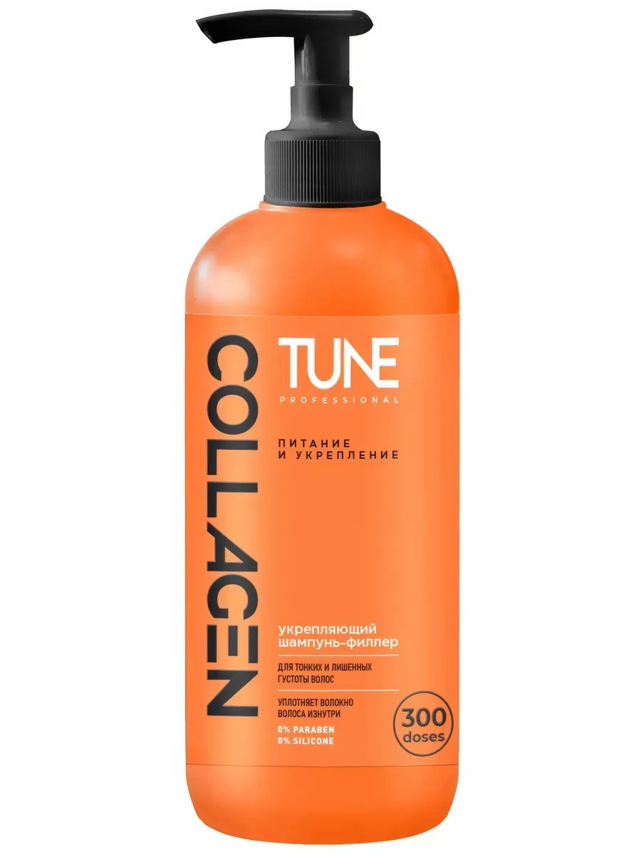 Tune Professional Collagen Filler Shampoo for fine, thin hair, with dispenser, 500 ml. TUNE FILLER SHAMPOO FOR DEEP HAIR RESTORATION Strengthening shampoo-filler with collagen, extracts of centella asiatica and fucus, avocado and wheat germ oils deeply nourishes, restores and strengthens fine and thin hair. Ingredients: Aqua, Sodium Laureth Sulfate, Cocamidopropyl Betaine, Sodium Chloride, Alkyldimethylamine Oxide, Glycerin, Soluble Collagen, Tocopheryl Acetate, Sodium Ascorbyl Phosphate, Retinyl Palmitate, Panthenol, Persea Gratissima Fruit Extract, Triticum Aestivum Germ Extract, Fucus Vesiculosus Extract, Centella Asiatica Extract, Citric Acid, Glycine Soja Oil, Sodium Benzoate, Potassium Sorbate, Propylene Glycol, Disodium EDTA, PEG-40 Hydrogenated Castor Oil, Methylisothiazolinone, Methylchloroisothiazolinone, Parfum.