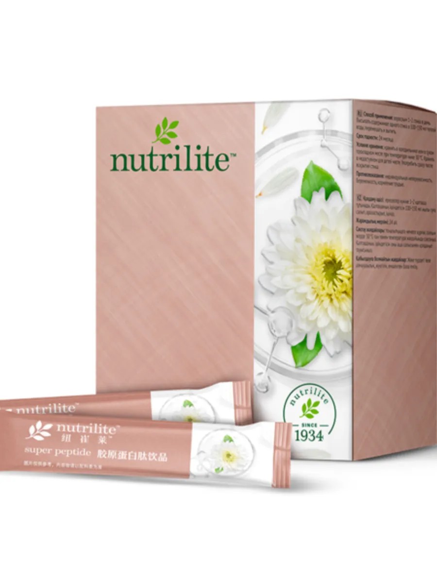 **Super Peptide Nutrilite** is an excellent solution for maintaining youthful skin: * density, * elasticity, * firmness of the facial contours, * an even complexion. The product affects the key underlying mechanisms of skin aging, providing a visible effect. **What is collagen?**Body tissues are not only made up of cells. Most of the volume within tissues is made up of the extracellular matrix (ECM), which acts as a solution that binds our cells together. This solution is held together by a framework formed by strong and elastic threads, which are collagen. 30% of the protein mass of our body consists of collagen. Since collagen is the most abundant protein in our body, its quantity increases as the body grows. This occurs until about age 27. After that, the body loses ~ 1% of its collagen mass per year. This decrease is most noticeable on the face in the form of wrinkling, loosening and sagging skin, unwanted changes in complexion. **The strength of collagen threads is influenced by many factors:*** We cannot influence: genetics, individual characteristics, aging, destruction of the framework under the influence of environmental factors.* We can influence: nutrition, care, provision of vitamins and minerals, smoking, stress, high sugar levels. **Super Peptide Nutrilite** works on the deep mechanisms of skin aging: * Stimulates the production of its own collagen * Improves the contractility of fibroblasts (cells that produce collagen in the skin) * Slows down the processes of negative changes in the upper layers of the skin due to the pronounced antioxidant effect * Significantly reduces the number and severity of age spots * Significantly reduces the yellowness of the skin * Does not contain animal components (Halal product) Ingredients Oligopeptide from fish skin; sweetener: xylitol; Soy peptide; carrier: maltodextrin; Acidity regulator: citric acid; Chrysanthemum extract (Chrysanthemum morifolium); carrier: sodium carboxymethylcellulose; Stevia extract; emulsifier: modified corn starch; natural pineapple flavor; sugar; natural pear flavor; natural peach flavor; supporting agent: hydroxypropyl methylcellulose; Contains soy and fish. Does not contain GMOs.