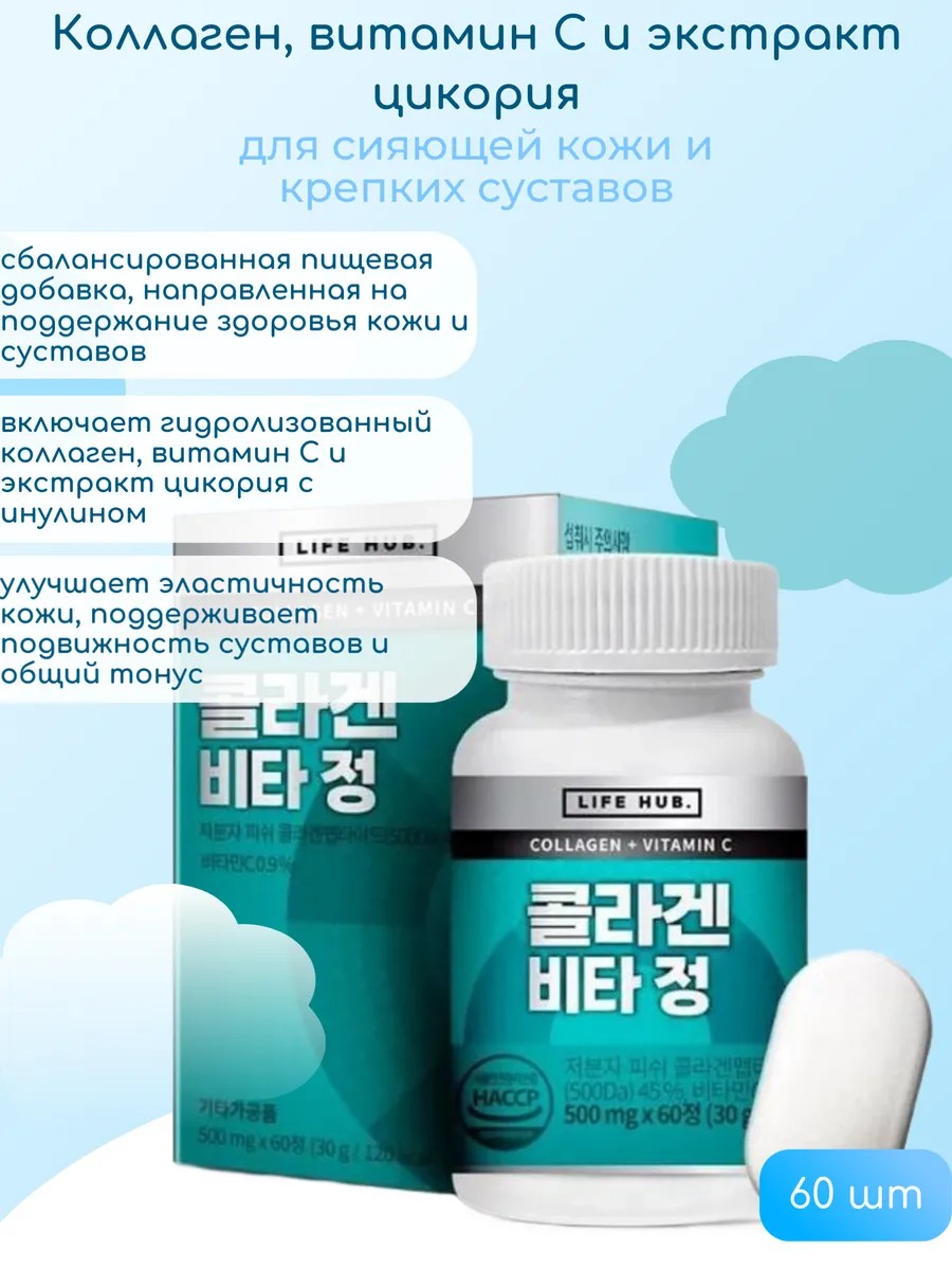 | Trade name | Dietary supplement "Collagen, Vitamin C, and Chicory Extract for Glowing Skin and Strong Joints" / "Fish Collagen Tablets with Vitamin C" under the LIFE HUB brand. |