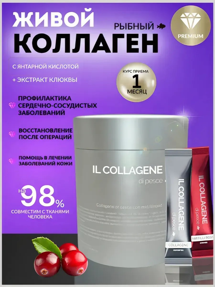 Состав: концентрированный нативный коллаген из диких речных рыб, созданный по инновационной технологии с ионизированной водой, янтарной кислотой, аминокислотами и витаминами. Формула усилена витамином C и клюквой, богатой микроэлементами, стимулирует выработку коллагена, укрепляет иммунитет, улучшает работу ЖКТ.