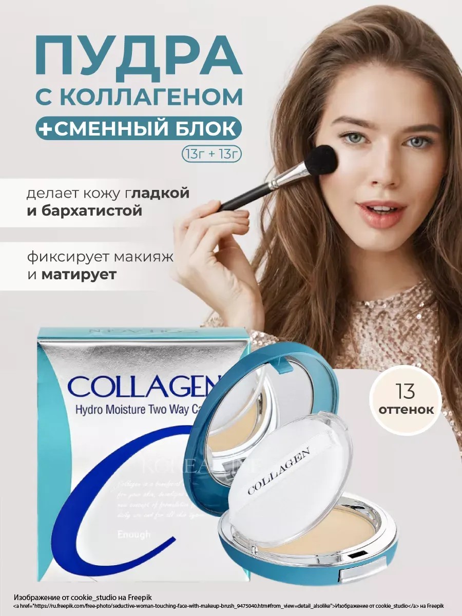 Enough Collagen, a moisturizing compact powder with collagen, creates a perfect matte finish. It pairs well with foundations of the same brand and shade. Collagen makes skin firmer and more elastic. The powder adapts to your skin tone without irritating it, concealing imperfections such as freckles, age spots, and uneven skin tone. Its finest particles and light texture allow the powder to apply in a thin, even layer, leaving skin amazingly smooth and even-toned, ensuring a natural, smooth, and flawless appearance. It controls sebum production, minimizing shine. Directions: Apply evenly to your face with a powder puff, patting gently. Repeat if necessary. Our products are genuine and are sold directly from the Korean manufacturer. [This sentence appears to be a mistranslation.]
