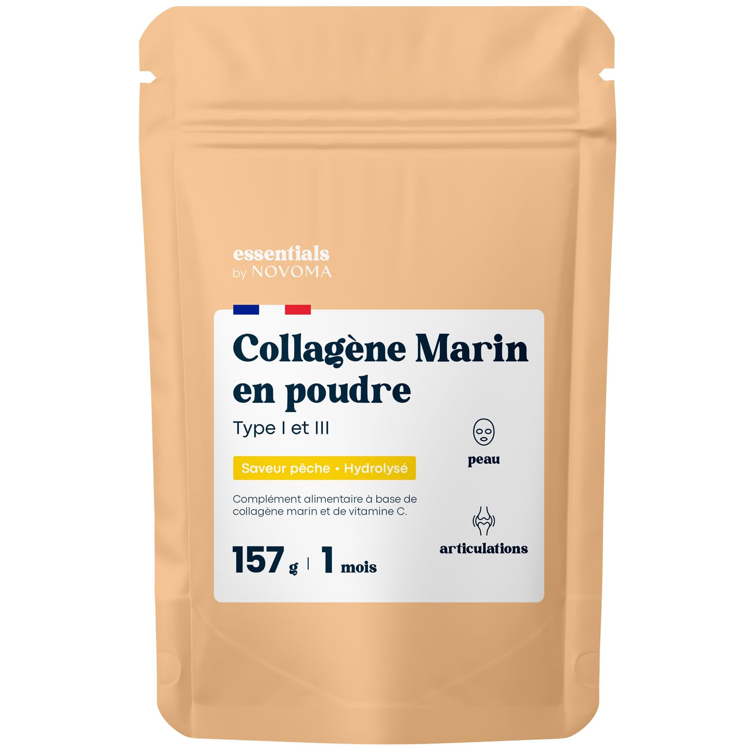 PREMIUM QUALITY. Sourced from the Black Sea, our collagen powder is packaged in France. For impeccable quality, it is guaranteed GMO-free, gluten-free, and additive-free. CONVENIENT AND ENJOYABLE. Our peach-flavored collagen mixes easily in water, smoothies, or post-workout drinks. Its light, natural aroma makes it a simple and pleasant addition to your daily routine. 1-MONTH PROGRAM. To combat the signs of aging, simply take 5.2 g of powder daily (2 teaspoons). Our 157 g pouch provides a 1-month supply. HYDROLYZED MARINE COLLAGEN 2000 DALTONS. Our type 1 and 3 collagen powder is obtained through hydrolysis, a process that produces low molecular weight peptides (2000 daltons) for optimal absorption. It is enriched with vitamin C, a powerful antioxidant that promotes collagen synthesis. 30 SKIN HYDRATION IN 8 WEEKS. Natural collagen production decreases with age (-1 per year from age 25). Our marine collagen helps compensate for this loss: it promotes skin hydration and elasticity as well as joint comfort (scientifically proven effectiveness).QUALITÉ PREMIUM. Originaire de la Mer Noire, notre poudre de collagène est conditionnée en France. Pour une qualité irréprochable, elle est garantie sans OGM, sans gluten et sans additifs. PRATIQUE ET AGRÉABLE. Notre collagène saveur pêche se dilue facilement dans l'eau, les smoothies ou les boissons post-entraînement. Son arôme léger et naturel en fait une option simple et agréable à intégrer à votre routine quotidienne. PROGRAMME DE 1 MOIS. Pour combattre les signes de l'âge, il vous suffit de prendre 5,2 g de poudre chaque jour (2 cuillères à café). Notre sachet de 157 g permet une cure de 1 mois. COLLAGÈNE MARIN HYDROLYSÉ 2000 DALTONS. Notre poudre de collagène de type 1 et 3 est obtenue par hydrolyse, procédé permettant d'obtenir des peptides de faible poids moléculaire (2000 daltons) pour une absorption optimale. Elle est enrichie en vitamine C, un puissant antioxydant qui favorise la synthèse du collagène. 30 D'HYDRATATION DE LA PEAU EN 8 SEMAINES. La production naturelle de collagène diminue avec l'âge (-1 par an dès 25 ans). Notre collagène marin aide à compenser cette perte : il favorise l'hydratation et l'élasticité de la peau ainsi que le confort articulaire (efficacité scientifiquement prouvée).Collagene Marin Poudre Type 1 et 3, Saveur Pêche, Peptides Hydrolysés 2000 DA, Peau Hydratée Articulations Souples, Sachet 157g, 5g par jour, Cure de 30 jours, Essentials by Novoma