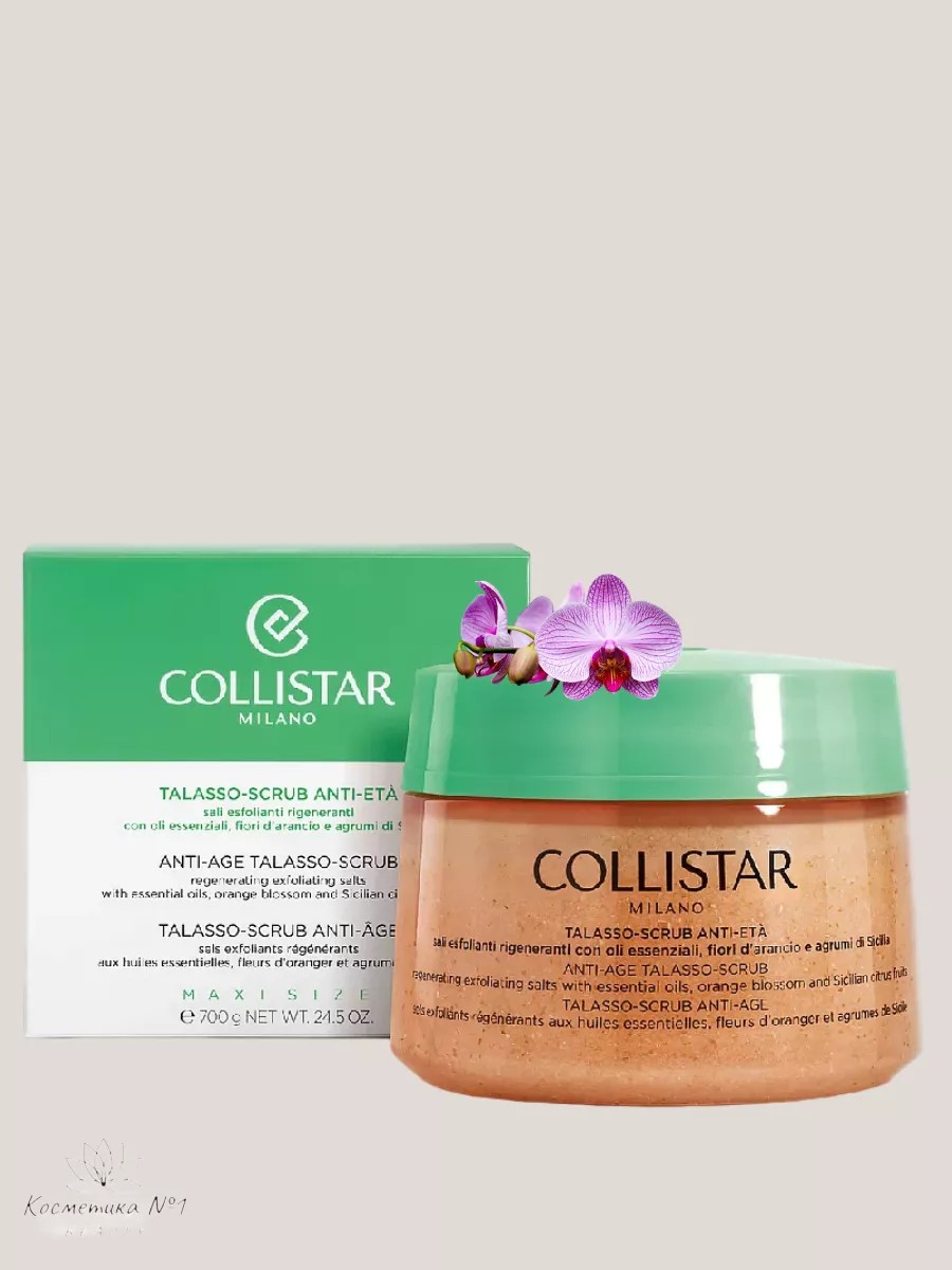 Collistar Thalasso-Scrub Anti-Eta Anti-Aging Thalasso Body Scrub—a product with essential oils, orange blossom extracts, and Sicilian citrus fruits—combines all the benefits of thalassotherapy. This product performs four distinct actions to leave your skin looking healthy and radiant. The first action is exfoliation and renewal. Sea salt accelerates skin cell renewal, removes dead skin cells, and leaves skin smooth and soft. The second action is free radical protection and skin brightening. Sicilian citrus fruits, rich in alpha hydroxy acids, flavonoids, and vitamin C, combat skin aging and prevent the formation of age spots. This helps skin appear brighter and fresher. The third action is regenerating and anti-aging. Orange blossom extract contains flavonoids and antioxidants that help improve skin tone and protect against premature aging. The fourth action is restoration. Citrus essential oils and orange blossom oil provide an invigorating effect and enhance the effectiveness of the other active ingredients. This essential oil scrub is suitable for all skin types and does not contain harsh chemicals.