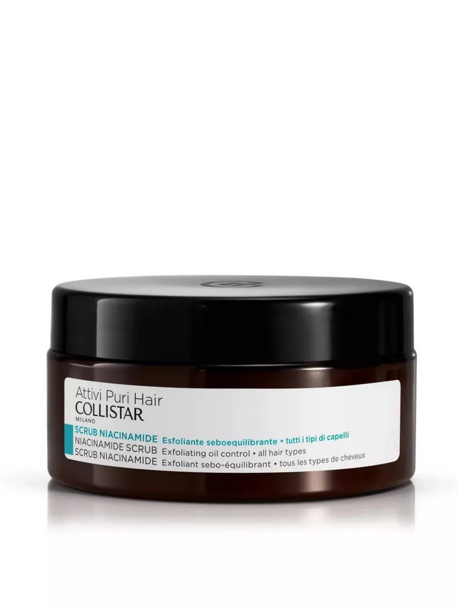 Niacinamide Scrub из линии Моносывороток для волос (Attivi Puri Hair) Collistar - скраб для кожи головы и волос с ниацинамидом. Cкpaб имеет пастообразную текстуру и регулирует уровень кожного сала. Это - детокс-пилинг которая мгновенно удаляет поверхностные скопления излишков кожного сала, загрязнения и микропыль и возвращает волосам естественный блеск, не повреждая защитный кожный барьер. Скpaб идеально подходит в качестве средства после окрашивания для удаления остатков химикатов. Его формула содержит морскую соль – натуральный эксфолиант, который освобождает кожу головы от загрязнений и стимулирует микроциркуляцию крови. Подходит для всех типов кожи и волос. ПРИМЕНЕНИЕ: Намочите волосы и разделите их на пряди, время от времени нанося небольшое количество продукта. Тщательно помассируйте до образования эмульсии (при необходимости добавьте воды), которая тщательно очистит кожу, освободив ее от загрязнений. Тщательно промойте и нанесите шампунь и средство после шампуня (кондиционер или маску).