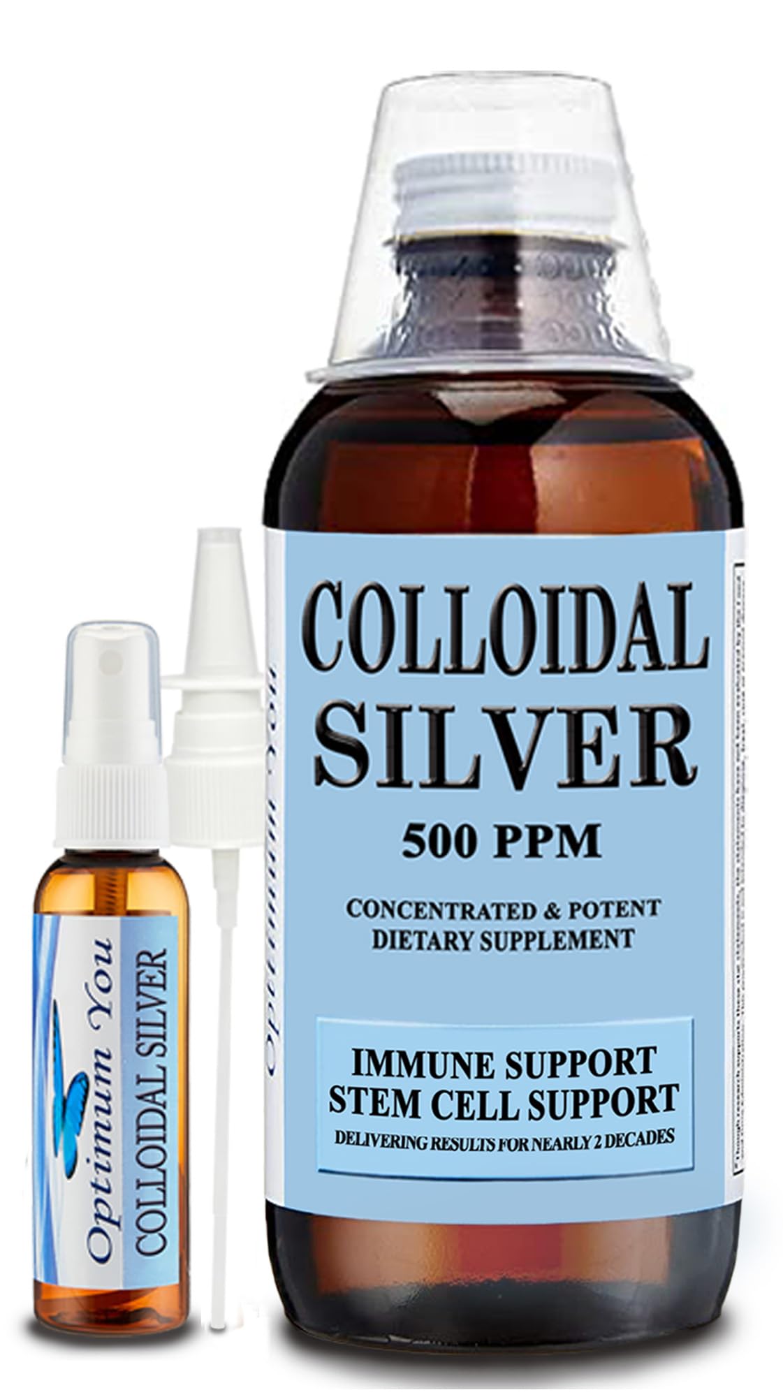 PACKAGED IN AMBER GLASS BOTTLES The amber-colored glass bottles are required to protect the colloidal silver from light and ensure that contaminants do not leach into the colloidal silver. (The empty two-ounce spray bottle is plastic and should be used to temporarily store small amounts of silver for spraying.) For nearly two decades, our unwavering commitment has been to deliver quality yielding excellent, dependable results, providing you with the reassurance you need to take control of your health. LIGHT IN COLOR, NOT IN STRENGTH Optimum You Colloidal Silver, 500 ppm, made of silver ions that are approximately 1 nm in size or smaller, is a versatile solution for your health needs. Its light color, a result of its small particle size, makes it more effective than the darker amber-brown colored silvers with much larger particle sizes. Optimum You Colloidal Silver, 500 ppm, delivers safe, gentle, extra-strength immune support with every drop! Experience its extra-strength results. Use on blisters, bedsores, cuts and other wounds. Use for allergies, sinuses and nasal passages. Its extra strength empowers you to take control of your health. CONVINCE YOURSELF THAT EXTRA STRENGTH IS NOT A MYTH Spray 10-30 ppm on a new cut every 15 minutes for a few hours while observing the changes to the cut. Then, spray our Optimum You Colloidal Silver, 500 ppm on a new cut every 15 minutes for a few hours while observing the changes. Seeing is believing! The extra strength of Optimum You Colloidal Silver, 500 ppm is not a myth!. HOW TO USE IT Optimum You Colloidal Silver is fully bioactive. The small silver ions can pass through the skin under your tongue. Hold it under your tongue for quick absorption. Drink Optimum You Colloidal Silver at full 500-ppm strength. It's is safe for the whole family. Drink it, or spray it. Use Optimum You Colloidal Silver full-strength in the handy spray bottle for an excellent face mist. Spray it all over since the skin readily absorbs and responds to it. This versatility empowers you to choose the method that best suits your needs. Though full strength is recommended, you can add a few drops to distilled water tocreate hundres of 10-30 ppm bottles!. WHY 500 PPM MEANS EXTRA STRENGTH 500 ppm, a measure of concentration and potency, stands for parts per million. At this level, Optimum You Colloidal Silver contains 500 all-natural silver particles per liter of distilled water. This concentration, 50 times higher than most silver products, is a testament to its potency. The 500 ppm concentration makes it one of the most subtle yet effective natural antimicrobials for your body. . WOUND HEALING Recommended by physicians and natural health professionals for wound care. Trusted by experienced Silver Spray Optimum You Colloidal Silver, 500 ppm, on the area of concern every 15 minutes or as often as possible on the first and or second day. Watch for the possibility of accelerated healing. Then, spray at least three times a day each following day until the desired effect is attained. LOVE THE SKIN YOU'RE IN Optimum You Colloidal Silver 500 ppm is trusted to help the body eliminate acne. It can stimulate and support stem cell production. The stem cells can replace old and damaged skin cells, rejuvenating the skin and helping it keep its healthy, youthful glow! Spray your face each day immediately after you wash and allow it to air dry. Do this regularly and witness the potential transformation. ALLERGY SUPPORT SINUS RELIEF Helps the body heal fast! Drink Optimum You Colloidal Silver, 500 ppm and spray it in nasal passages and wherever needed to encourage your immune system to work better in that specific area. Cleanses nasal passages so you can breathe freely. Eases air flow and allows for clearer breathing. Remember that your immune system uses broken down proteins as a part of its arsenal. So, chronic allergy issues may also require the support of increased highly complete proteins sources. Take both approaches to strengthen your immune system for superior allergy support and sinus relief. HOW COLLOIDAL SILVER HELPS Optimum You Colloidal Silver 500 ppm, backed by scientific research and stimulates and supports the stem cells vital to the body's immune system. Stem cells circulate throughout the body and become whatever type of specialized cell the body needs to heal wounds and even produce beautiful hair and skin. The extra stem cells help strengthen the immune system, keeping it strong and ready to fight, helping the body heal faster. The 500 ppm concentration of Optimum You Colloidal Silver's extra strength helps the body attain improved immune support and overall health by replacing damaged cells wherever needed. WOUND HEALING Excellent wound healing support. Helps the body heal fast! Recommended by physicians and natural health professionals for wound care. Trusted by experienced Silver users. Spray Optimum You Colloidal Silver, 500 ppm, on the area of concern every 15 minutes or as often as possible on the first and or second day. Watch for the possibility of accelerated healing. Then, spray at least three times a day each following day until the desired effect is attained.