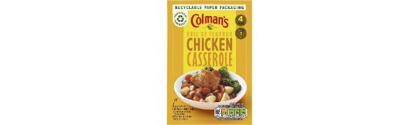 Create tasty, hearty meals for the whole family to enjoy with a packet of Colman's Chicken Casserole Recipe Mix. With our blend of herbs and spices, serving a meal full of rich flavours has never been easier. When you've got our recipe mix on hand, all you'll need is some chicken, onions and carrots to whip up a delicious meal. By following just a few easy steps, you and your family can enjoy the rich taste of Colman's unmistakably delicious chicken casserole mix, which delivers the full-on flavour you deserve. With our carefully selected blend of ingredients, you can now prepare tasty meals and family dinners with no artificial colours, preservatives, or added MSG – so everyone around your table can share the simple joy of good food. Let your imagination run wild and add your favourite flavour combinations for your perfect meal. At Colman's, we believe you deserve the very best. That's why we select quality ingredients for all our recipes, which are seasonally harvested to deliver great-tasting family favourites. We provide the sauce, you provide the imagination – what will you rustle up todayDiscover the rest of our cooking sauces and learn more about Colman's and our heritage by visiting our website. This recipe mix comes in paper packaging. Please recycle. INGREDIENTS Corn starch, salt, flavourings, onion powder (5.7 ) [1], tomato puree powder (4.4 ) [1], sugar, yeast extract, paprika (3 ) [1], WHEAT flour, herbs (parsley [1], sage, thyme [1], marjoram), BARLEY malt extract, lemon juice powder (sugar, lemon juice, salt) [1]. [1] From sustainable agriculture. May contain other cereals containing gluten, celery, eggs, milk, mustard and soy. Made to vegan standards, see ingredients section for allergens SAFETY WARNING sytay away from eye contact MANUFACTURER CONTACT INFORMATION Unilever UK, Freepost ADM3940, London, SW1A 1YR. See moreThis Colman's recipe mix provides 4 servings so you always have a delicious meal at hand. Turn every meal into a homely feast with Colman's Chicken Casserole Recipe Mix – just mix with water and add to your cooking!. This recipe mix contains no artificial colours, preservatives, or added MSG. Enjoy our Chicken Casserole Recipe Mix that comes in an easy-to-use, recyclable paper pack. Casserole mix with a delicious blend of onions and herbs that lets you enjoy a rich, warming classic dish in just a few easy steps. Quickly create a great tasting chicken casserole that will satisfy the whole family using Colman's Chicken Casserole Recipe Mix, which delivers a full-on British flavour experience.