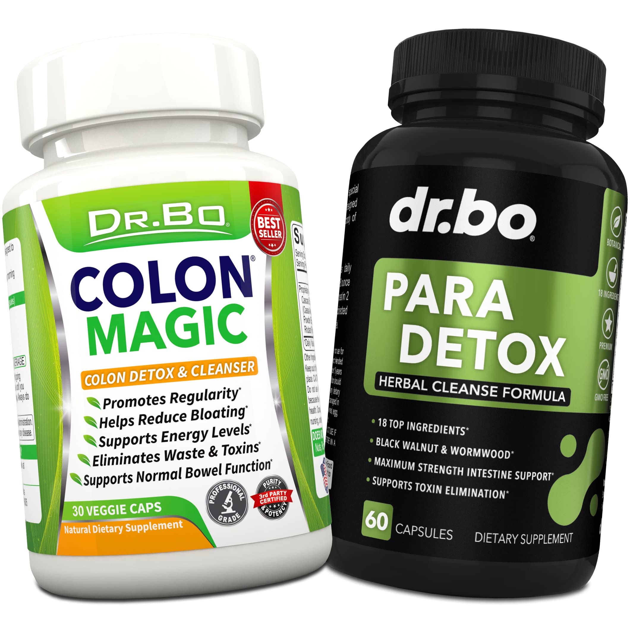 Having gut issues? Want to do a colon detox para cleanse and flush out that old waste? You may need to do a full body gut cleanse detox to purge those unwanted intruders & renew health. Our colon cleanse para detox supplement is a powerful, yet gentle formula to help rid the body and gut of harmful organisms. Effective human detoxification & flush for a healthy stomach and gut cleanse detox to promote health benefits for adults and children. Need intestinal support? The ultimate natural blend of herbs to help support a healthy balance of microflora in the stomach and digestive tract for adults & kids. This colon cleanser anti discomfort for humans helps detox, cleanse & flush to help fight gas, bloat & constipation. 18 premium ingredients all in one bottle. All the powerful herbs & ingredients you want to help cleanse and flush out stomach of outside factors like wormwood black walnut, cranberry, goldenseal, cloves, garlic, pau d'arco, papaya, echinacea, apple pectin, wood betony, pumpkin seeds, blueberry, grape root, butternut, zinc, carrot & more! Get maximum strength supplements while still being gentle on the stomach and digestive system. These black walnut wormwood capsules with clove, cranberry, goldenseal, garlic, wood betony, papaya & more help guard the stomach & colon against unwanted intruders. These pro supplements for intestine cleansing are a must-have for kids and adults! Our black walnut wormwood complex contain these beneficial factors and more to provide an effective supplement for humans. Get these 2 best ingredients to rapid purge those unwanted internal guests & toxins. Kill off outside factors with these wormwood black walnut complex intestinal pills for humans. Our intestinal para cleanse and detox supplements tablets provide a combination of herbal ingredients for children and adults that want to live a healthy life and support and guard their intestinal tract daily. Get the edge over unwanted toxins & support bowel movement waste removal.Natural Colon Cleanser - Easy & gentle formula by Dr Bo to help a full bowel movement every time & support gut health. A healthy dietary supplement instead of laxative cleansers. Max Strength & Gentle - These black walnut wormwood capsules with clove, papaya & more help guard the stomach and colon against unwanted intruders. Must-have pro supplements for intestine cleansing!. Detox Pills & Constipation Relief - Our quick premium colon detox kit has the best psyllium husk, senna, aloe vera, cascara sagrada, rhubarb, barberry & slippery elm formula. Cleanse deep gut waste for a healthy stomach & cleaner bowel. Para Cleanse - Our para detox supplement is a powerful & gentle formula to help rid the body of harmful organisms. Effective human detoxification and flush for a healthy stomach and gut cleanse detox. Cleansing Capsules - Colon Magic is a gentle cleanser for men & women. Natural herbal pills for constipation fast & daily regularity relief. Pure, super potent detox blend with extra strength for a total bowel movement & colon cleanse for gut balance.