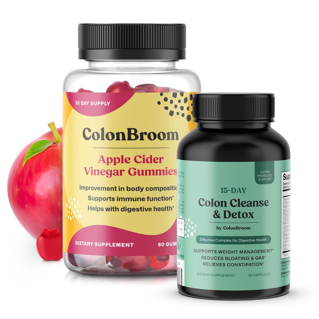 Our ColonBroom 15 days cleanse detox pills are designed to detox your gut, improve digestion, and support weight management, all while keeping you feeling light and energized. Unlike other harsh laxative-based detox supplements, our Colon Broom body detox and cleanse for women formula goes beyond just flushing waste. We've combined the power of probiotics, magnesium, fiber, and ginger to cleanse your digestive system gently and effectively, without causing cramping, dehydration or discomfort. This complete belly reset formula promotes gut health and fat metabolism helping balance the gut microbiome while improving digestion and nutrient absorption. A healthy gut plays a crucial role in maintaining a fast metabolism and reducing bloating, making weight management cleanse more sustainable. To further enhance digestion, ginger root and MCT oil help reduce bloating, support fat breakdown, and keep energy levels high, ensuring you feel lighter and more revitalized throughout the day. Unlike many bowel movement supplements that rely solely on harsh laxatives, this detox and debloat for women formula promotes natural regularity without discomfort. Magnesium draws water into the intestines for a smooth and gentle cleanse, while fiber supports digestion and waste elimination, making this detox both effective and easy on the body. Many traditional cleansers can create dependency, but this balanced blend helps reset digestion and promote gut health without the risk of overuse or dehydration. With just two colon health capsules a day, this 15-day cleanse improves digestion and support metabolism, making it an effortless addition to any routine. Made with 100 natural ingredients and free from artificial additives it provides a gentle yet effective detox for long-term gut detox for women and weight management. Whether you're looking to reduce bloating, boost energy, or support a healthier metabolism, this bowel cleanse is designed to help you feel your best.Blended in the USA with Premium Quality: Crafted in the USA using carefully selected, high-quality ingredients, apple vinegar gummies ensure safety, effectiveness, and superior standards. Boosts Immune Health and Energy: Enriched with Vitamin B12, these apple cider vinegar gummies sugar free help strengthen your immune system and provide a natural energy boost to keep you active and focused. A Gentle Cleanse Without the Harsh Effects: Colon Broom Body cleanse detox for women men with Magnesium Citrate Fiber help you stay regular without bloating, cramping, or dehydration, so you can detox comfortably and naturally. Banish Bloating Boost Energy: Ginger Root MCT Oil support digestion, speed up metabolism, and improve nutrient absorption - no sluggish, drained feeling like other colon cleanser detox products. Gut Health Weight Management in One: Unlike others, our ColonBroom 15 day cleanse formula supports digestion, fat metabolism, and regularity with 5 Billion CFU probiotics - helping you lose weight while feeling great.