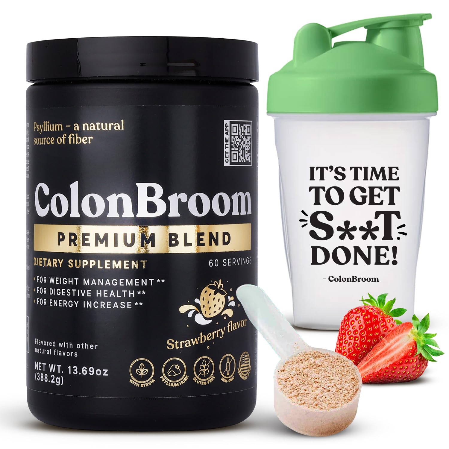 ColonBroom Premium Psyllium Husk Powder (Strawberry 60 Servings) + Shaker Bottle for Colon Broom Fiber Powder Drink Bundle - Colon Cleanse for Bloating Relief & Gut Health - Fiber Powder Supplement