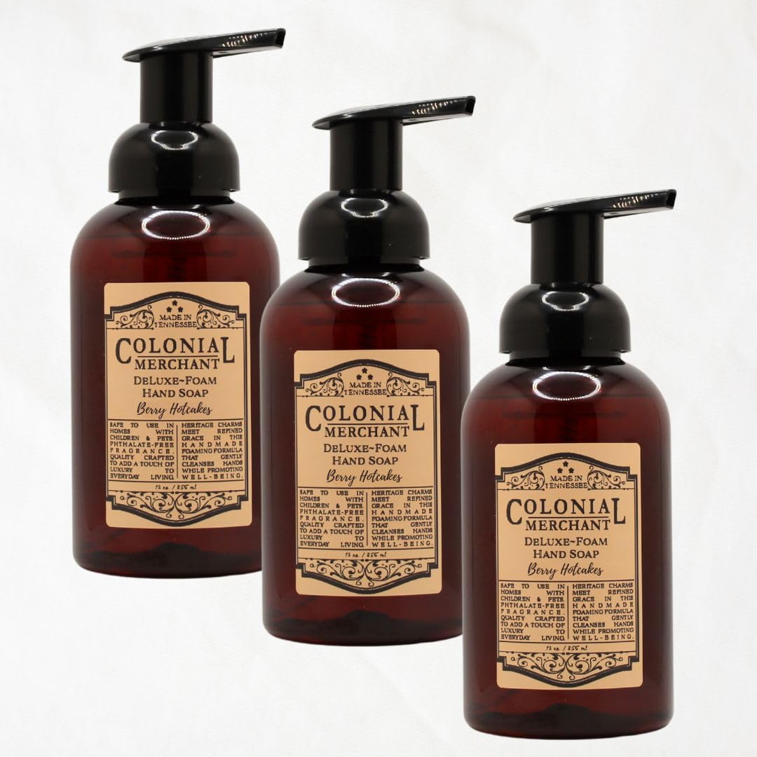 Berry Hotcakes times three—because one cozy sink moment just isn't enough. This 3-pack of foaming hand soaps blends ripe berries, vanilla crème, and warm maple syrup into a sweet scent story that channels country mornings and farmhouse brunch. Our skin-loving, sulfate-free formula creates rich foam and rinses clean. Made in small batches and inspired by Colonial Merchant's heritage aesthetic, this trio is perfect for gift baskets, rustic powder rooms, or simply spoiling yourself.