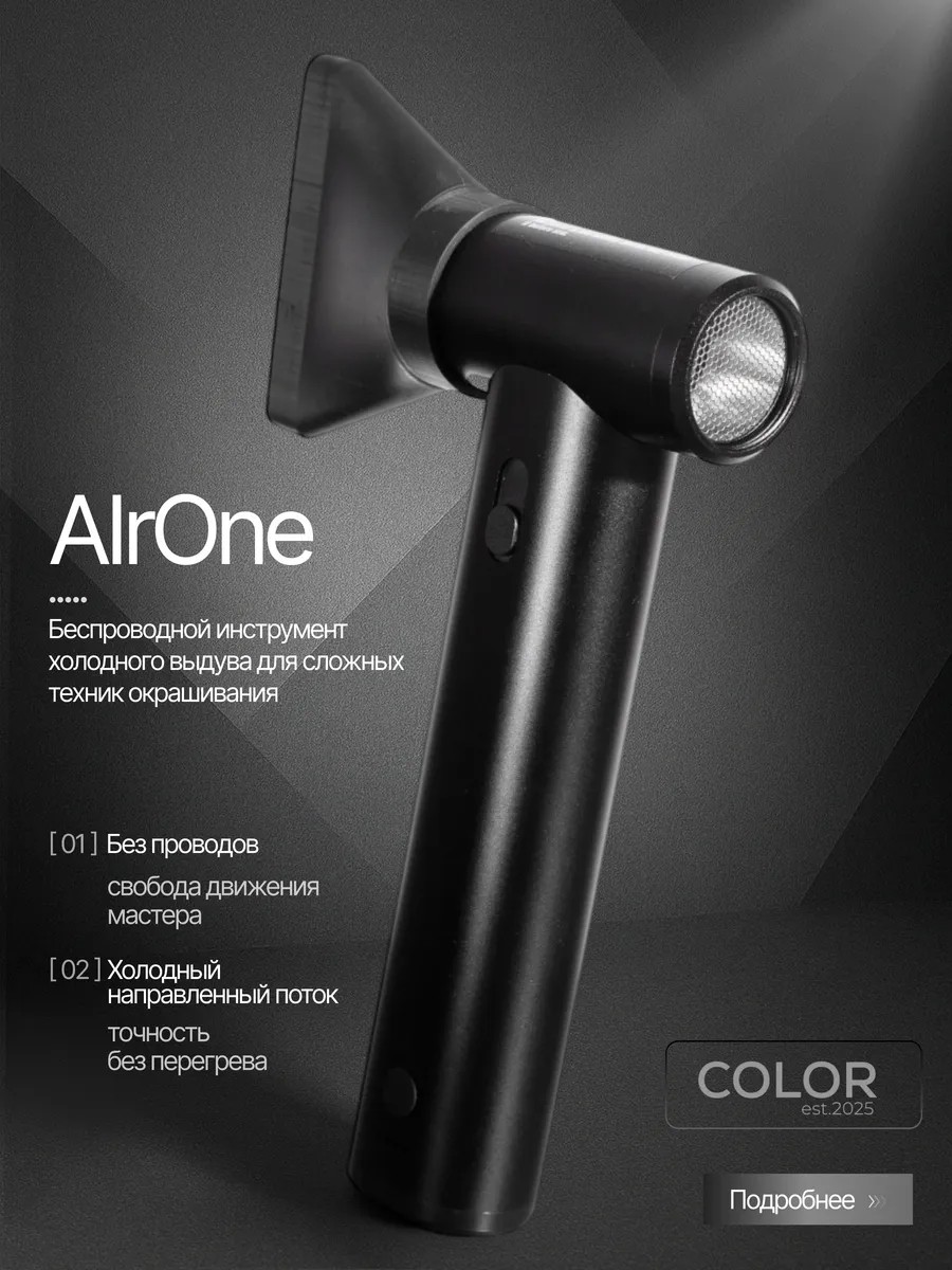 Беспроводное устройство для работы в сложных техниках окрашивания– это инновационный прибор, который станет отличной альтернативой традиционному фену для волос для выдувания слоев. Этот профессиональный аппарат оснащен удобной насадкой для выдачи равномерного потока холодного воздуха. Благодаря специальной насадке поток воздуха прямой, узко направлен на прядь волос, выдувает прядь без пробелов. Регулировка скорости работы с помощью бегунка позволяет подобрать оптимальный режим для парикмахера- колориста, от минимального до самого мощного. Мощность устройства 8000 мач, мощность потока воздуха 160 Вт. Аппарат мощнее многих профессиональных устройств, таких как Dyson (дайсон). Прибор весит около 400 гр, длина ручки 19 см. Аппарат без шнура, легкий и мобильный. Это не классический фен с нагревом, AirOne — это профессиональный инструмент, который используется в технике окрашивания Airtouch, где как раз важно отсутствие горячего воздуха. Он даёт мощный поток воздуха (до 52 м/с), что позволяет быстро и точно отделять пряди и сушить волосы без перегрева. Сушит — за счёт высокой скорости потока. Волосы при этом не пересушиваются, не травмируются. Это не просто вентилятор, а узкоспециализированное устройство с высокой скоростью вращения и концентрирующим соплом. Аккумуляторное устройство для airtouch станет отличным подарком для колористов, парикмахеров и всех, кто ценит качество и удобство.