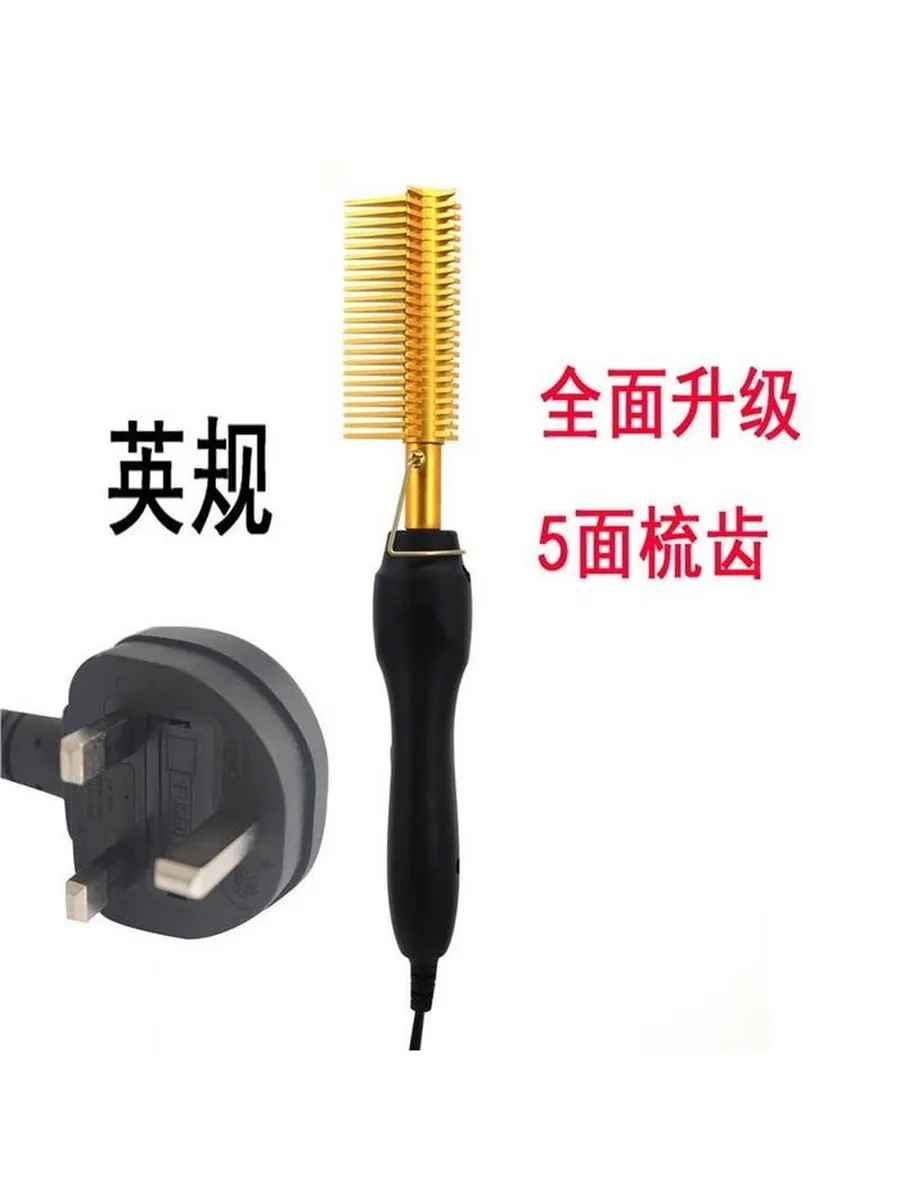 Electric Hair Styling Comb (1 Minute Heat Up, 5 Teeth, Copper Barrel, Straightening and Curling, Wet and Dry, Gold Color, UK Plug)