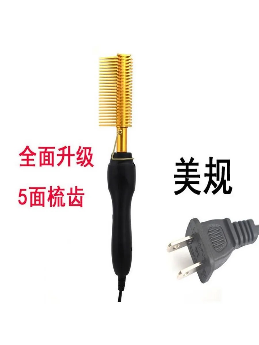 Electric Hair Styling Comb (1 Minute Heat Up, 5 Teeth, Copper Barrel, Straightening and Curling, Wet and Dry, Gold Color, US Plug)