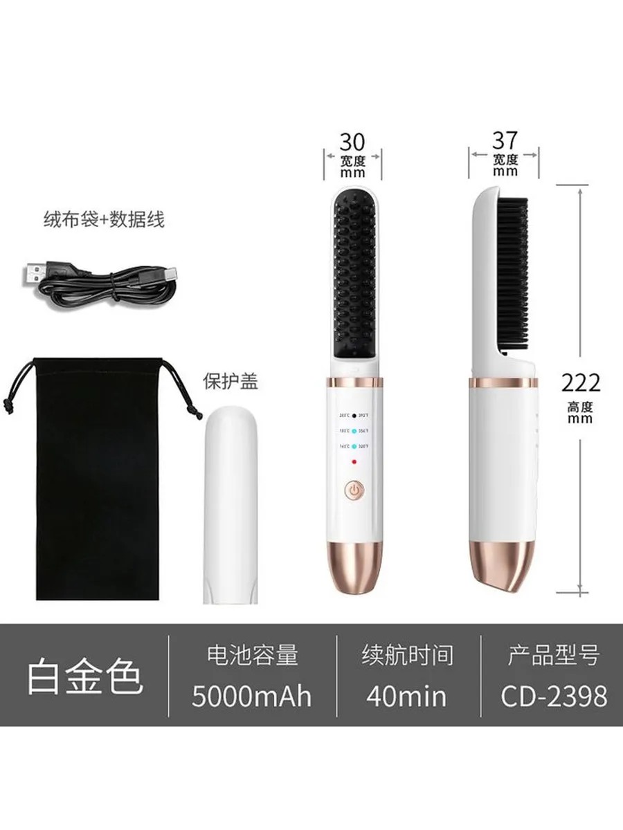 Тип продукта: Расческа для выпрямления и завивки. Материал теплопроводника: Керамическое покрытие. Источник питания: Беспроводной (литиевая батарея). Регулировка температуры: 3 режима. Мощность: 40 Вт. Напряжение: 3.7 В. Оптимальное время укладки: 5 минут.