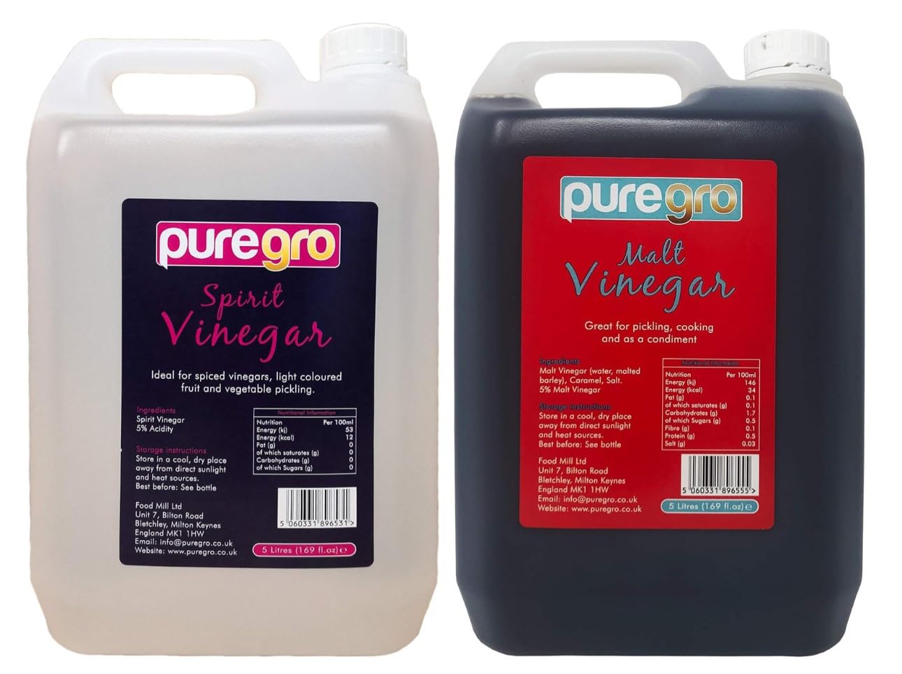 PRODUCT DESCRIPTION Puregro Spirit Vinegar is an amazing versatile product. It's perfect for Pickling, Cooking, Marinating, Baking, Making Sauces, Cheese and the food list is endless.This product is loved by chefs and foodies alike. On the otherhand it is great for all purpose cleaning. INGREDIENTS Spirit Vinegar : Spirit Vinegar , 5 Acidity. Malt Vinegar : Malt Vinegar (water, malted barley), Caramel, Salt. 5 Malt Vinegar