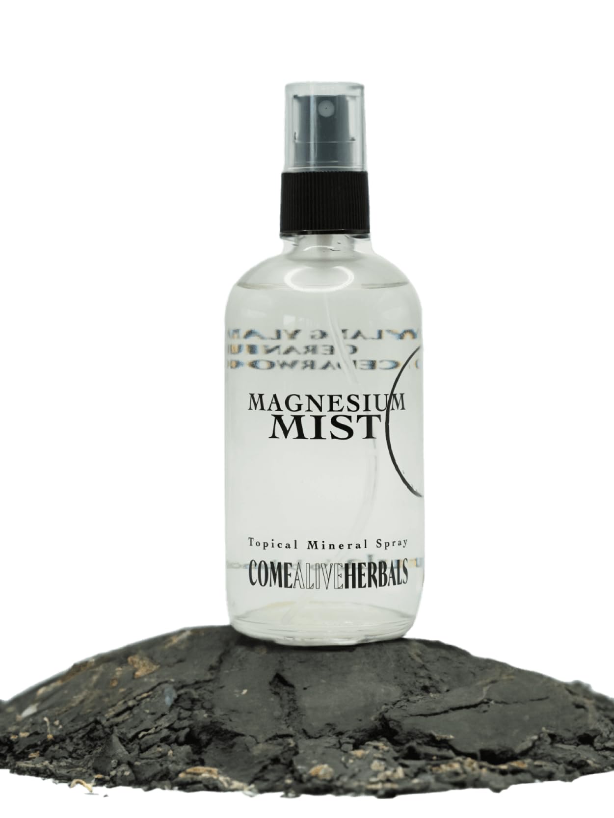 Come Alive Herbals Magnesium Mist is a versatile wellness essential designed to relax the mind, restore the body, and elevate your daily self-care ritual. Powered by highly absorbable magnesium chloride and a calming blend of botanical oils—including lavender, patchouli, cedarwood, and ylang ylang—this fast-acting spray delivers targeted support for sleep, sore muscles, hormone balance, and natural odor control. Magnesium plays a role in over 325 biochemical reactions in the body and is essential for energy, sleep, hormonal health, and immune function. This mist helps replenish magnesium levels while providing immediate relief from everyday stressors. Whether you're unwinding before bed, recovering after a workout, eg menstrual cramps, or switching to a natural deodorant, this multitasking mist has you covered. Use daily on feet, underarms, abdomen, or sore muscles to experience its grounding, therapeutic effects. A staple in your wellness toolkit, Magnesium Mist offers a holistic, plant-based solution with clean, consciously sourced ingredients. No synthetic fragrances, preservatives, or additives—just pure, powerful support for your well-being.Clean, Holistic Ingredients: Made with pure magnesium chloride and grounding botanical oils. 100 natural, free from preservatives, and packaged in a recyclable glass spray bottle. Natural Deodorant Alternative: Formulated to help regulate body odor and support a balanced underarm microbiome—free from synthetic fragrances or harsh chemicals. Muscle Cramp Relief: Ideal for sore muscles, post-workout recovery, and menstrual discomfort. Massage into affected areas to ease tension and support faster healing. Deep Relaxation Sleep Support: Built with magnesium chloride and soothing essential oils like lavender and ylang ylang to help calm the nervous system and promote deep, restorative rest. Multi-Use Wellness Spray: Designed to support restful sleep, muscle recovery, menstrual relief, and natural odor control—all in one calming, magnesium-rich formula.